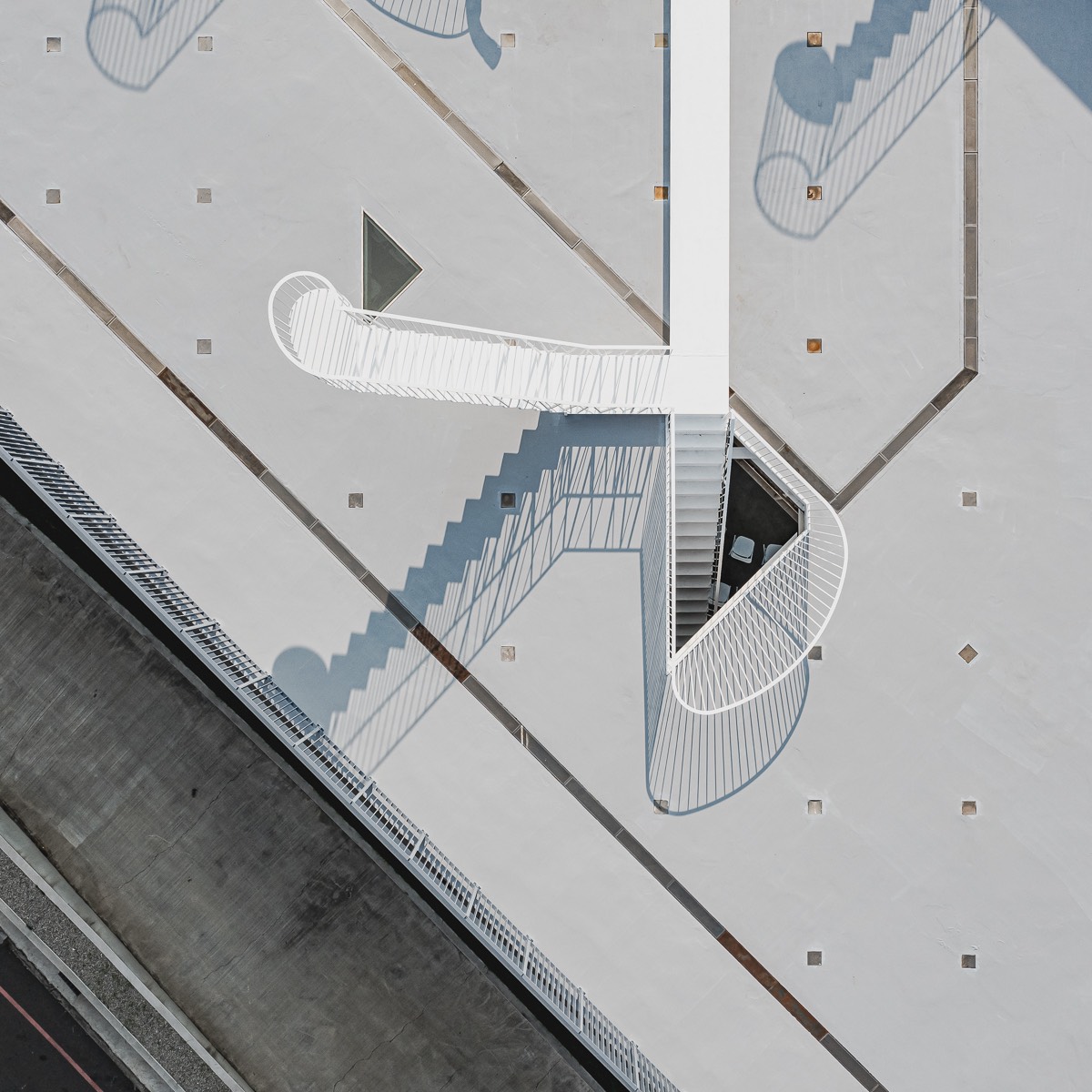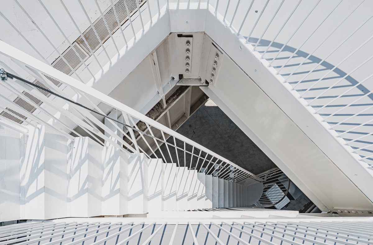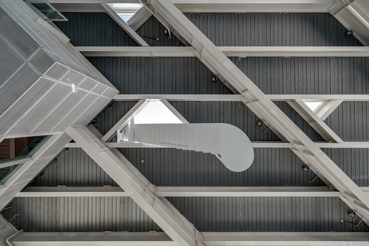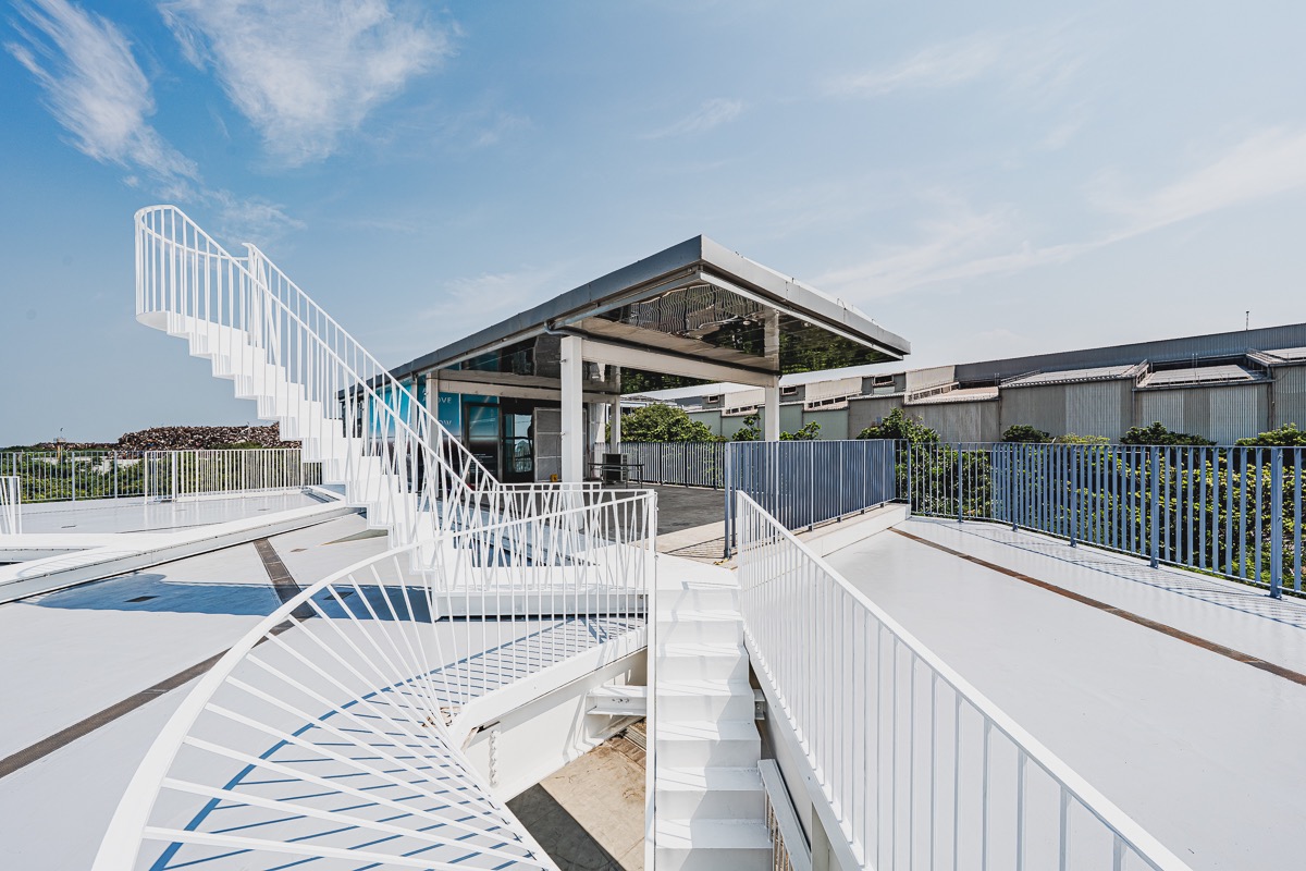 本屆作品由大尺建築操刀設計。團隊在離地十公尺的平台上開了三個天窗,植入三組鋼構作品。它們既是雕塑,也是能被攀登、凝視、體驗的小建築。鋼鐵不再隱於建築內部,而是以結構之美大方展現於外:每一道階梯、每一個扶手的比例與厚度,皆因結構需求而生,也因此處處可觀。