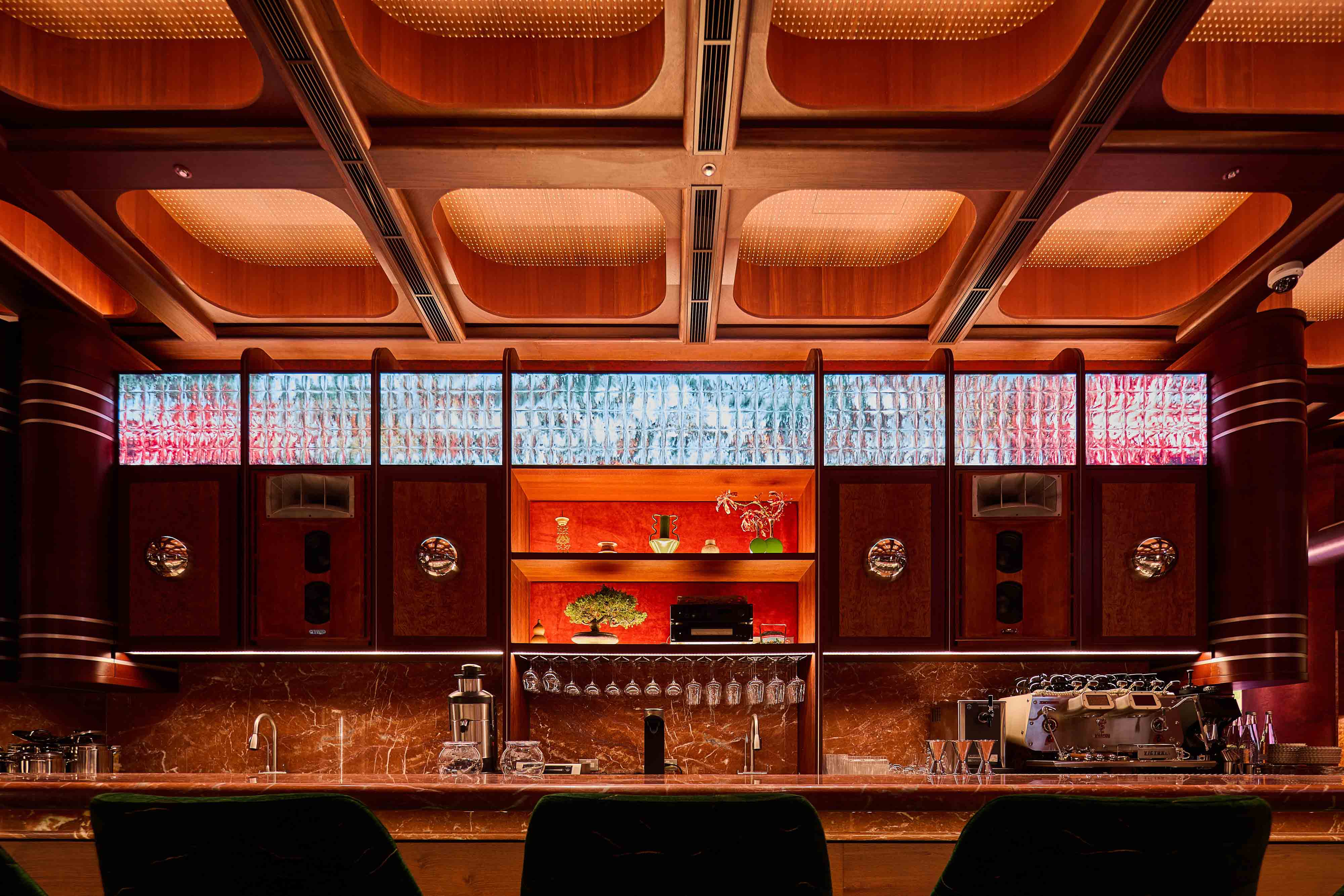 魔法感從一入門那一刻便開始。由設計團隊 Bito 操刀的動態影像設計,讓雙圓螢幕成為迎賓的序曲。流動的光影彷彿雲霧般蔓延,一瞬之間,現實的邊界被輕輕推開。吧台上方的互動影像結合圖像識別技術,隨來訪者的步伐與手勢而變化,像燭火閃爍、又似神獸掠影。除了色彩、材質的玩轉之外,心潮仙宮也特意讓光、影、聲共同構成一種新的餐廳語言。