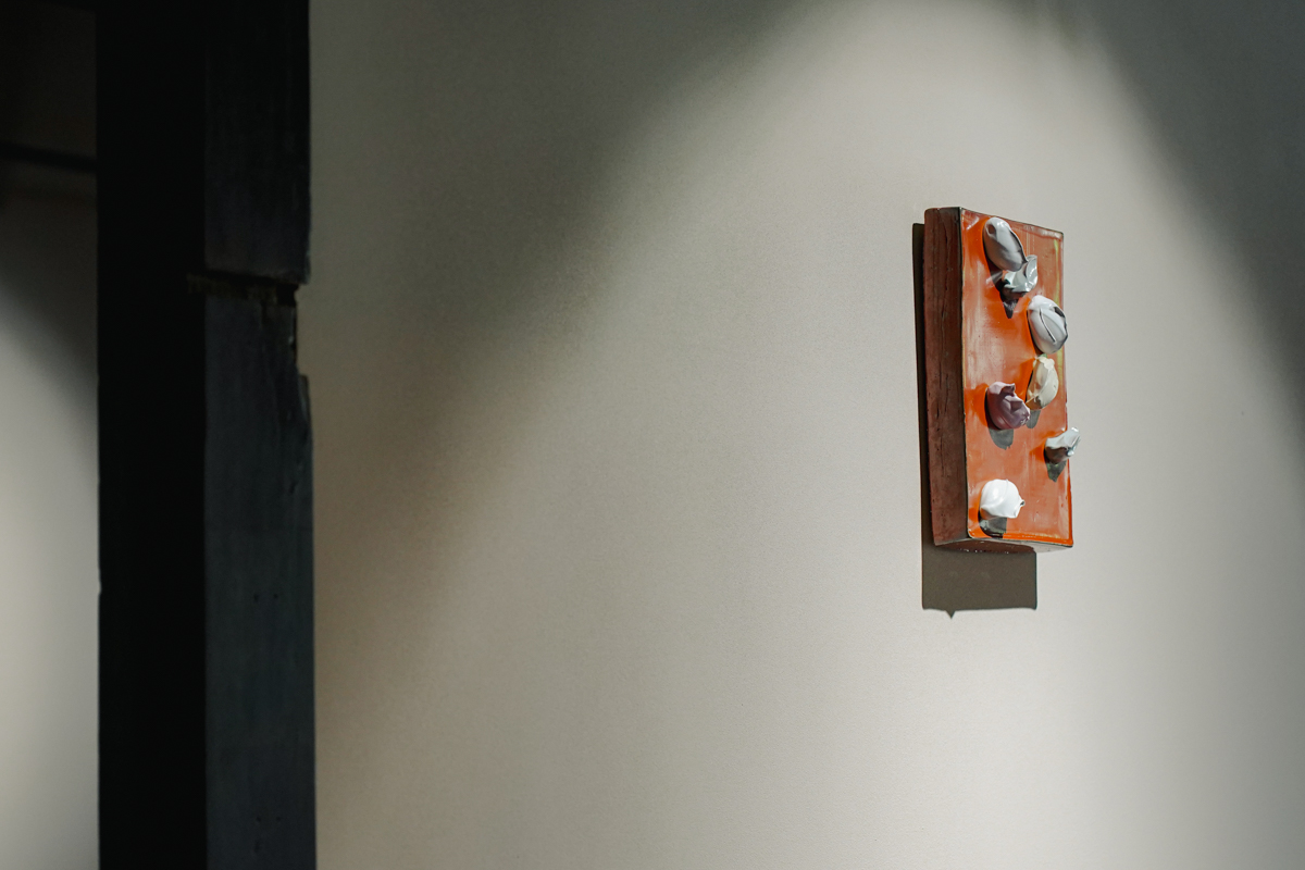 進入 1035 Collab 的木構展場,展覽的動線從「泥土」出發。一側牆面展出英國大地藝術先驅 Richard Long 以家鄉艾文河泥創作的泥土繪畫,他透過手的推抹與重複動作,留下自然流動的節奏。Richard 將步行與觸摸大地這種日常動作轉化為創作語言,詩意地探討人類和大自然間的關係,也成為此次展覽的精神起點。