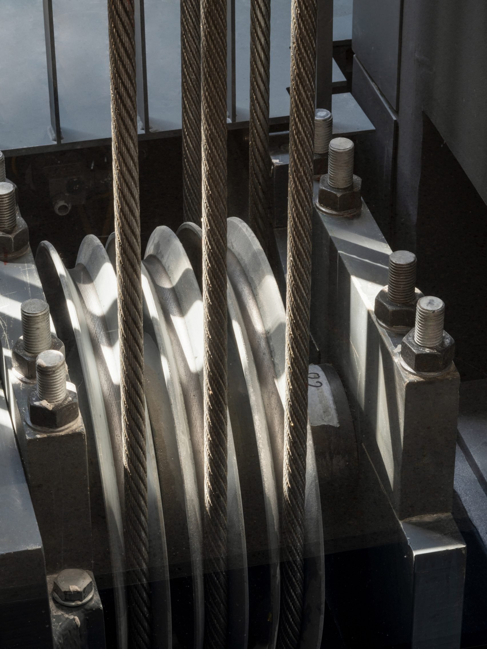 他在修復後的建築殼體中,設置五座可升降的巨型鋼製平台,每層面積介於 200 至 363 平方公尺、重量約 250 公噸,透過鋼索與滑輪系統升降。這些平台能自由調整至 11 種不同高度,讓展覽空間可以隨時重構。當平台對齊時,形成長達 1,200 公尺的展廳;當高低錯落時,則又成為多層次的展示舞台。