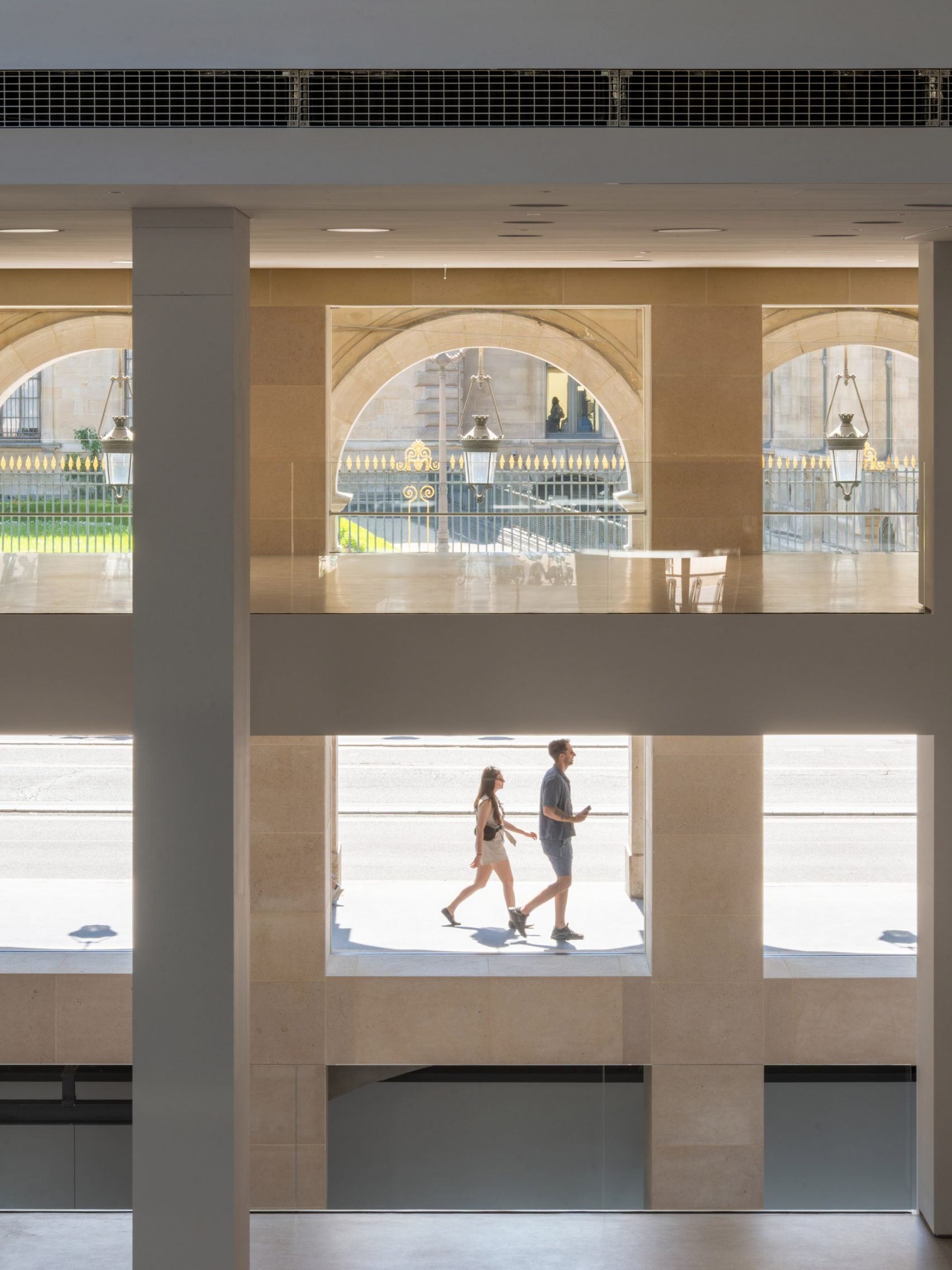努維爾稱這棟建築為「一個巨大的機械生命體」。光線從天窗灑入,遮光百葉像劇場幕簾般滑動;街道與館內的界線被完全打開。沿著 Rue Saint-Honoré,一條 150 公尺長的玻璃廊道貫穿 Rue de Rivoli 與 Palais-Royal,形成透明的行人通道。7 公尺高的玻璃窗與流動的動線,讓城市風景滲入展場,使巴黎成為展覽的一部分。