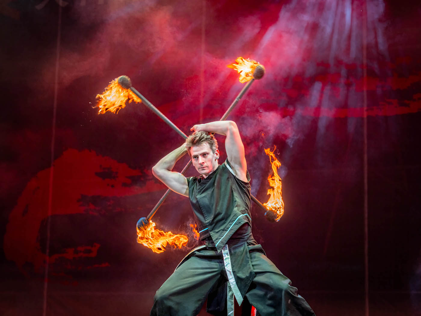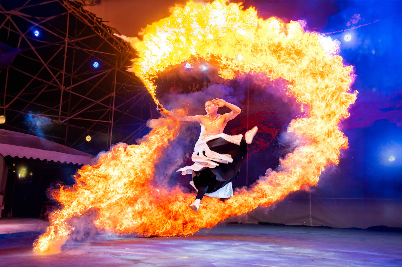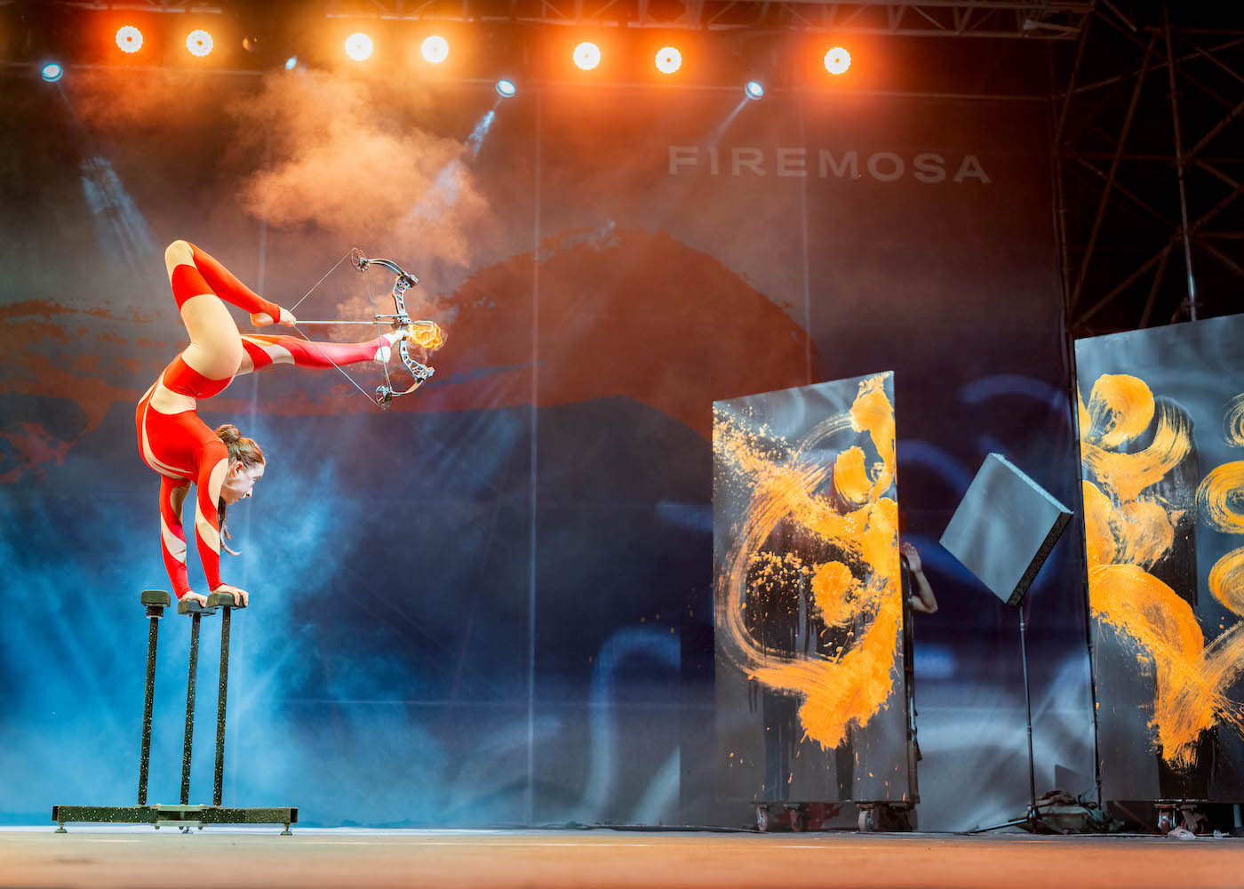 英國「空中腳射箭」表演家 Orissa Kelly,以力量、柔軟與精準的動作展現極致火舞藝術,曾登上里約奧運、NBA及《英國達人秀》舞台,表演結合光影與身體平衡,突破傳統雜技框架,被譽為「用腳詠火的藝術家」。