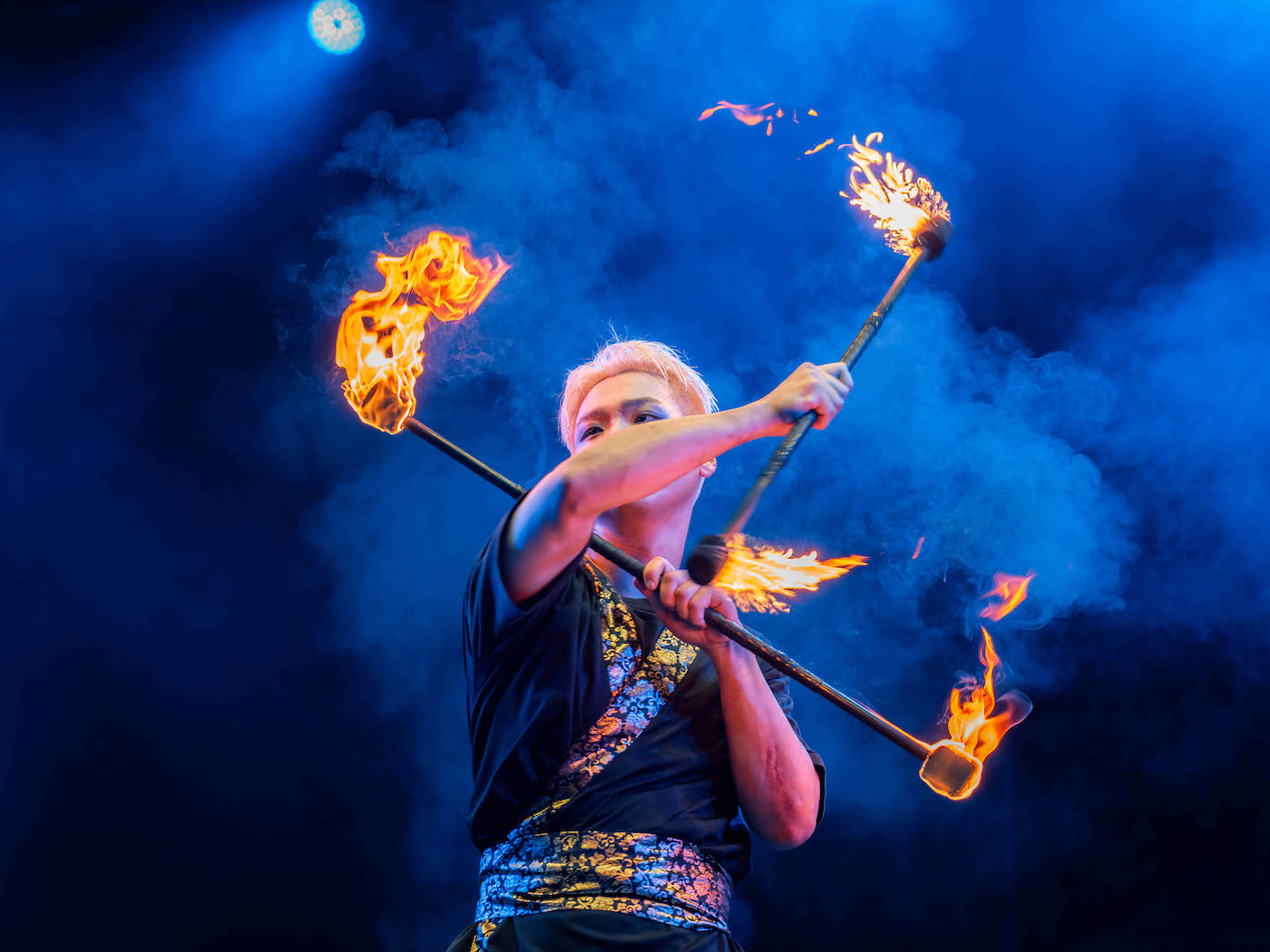 國際陣容包括日本武士火舞大師 Kiwamu Miyakubo,以沉穩氣勢和極高精準度著稱,精通武士刀術、古典劍舞與日本火球表演,能將禪意與武士精神融入肢體美學,曾於歐洲雜耍節、鳳凰火舞GALA、韓國春川藝術節等國際舞台演出。