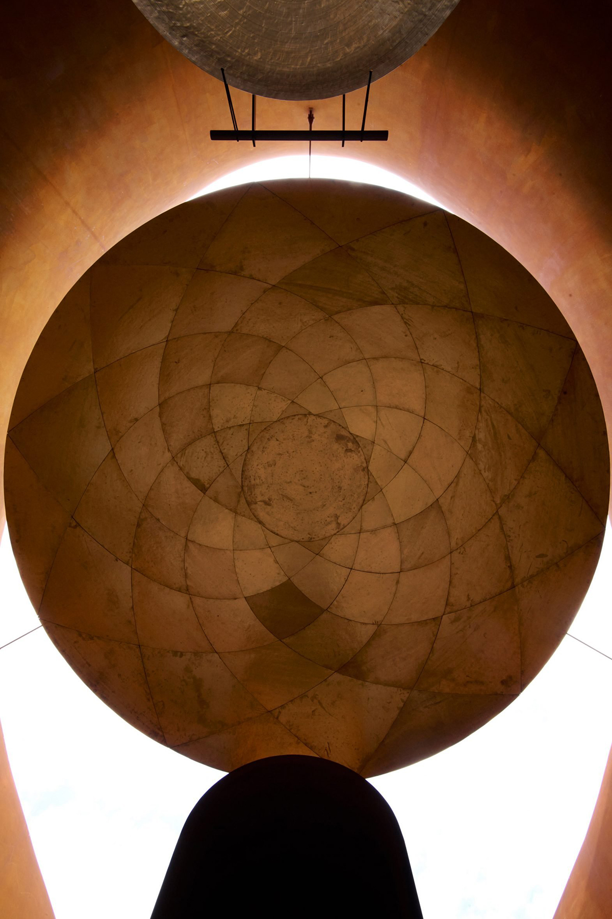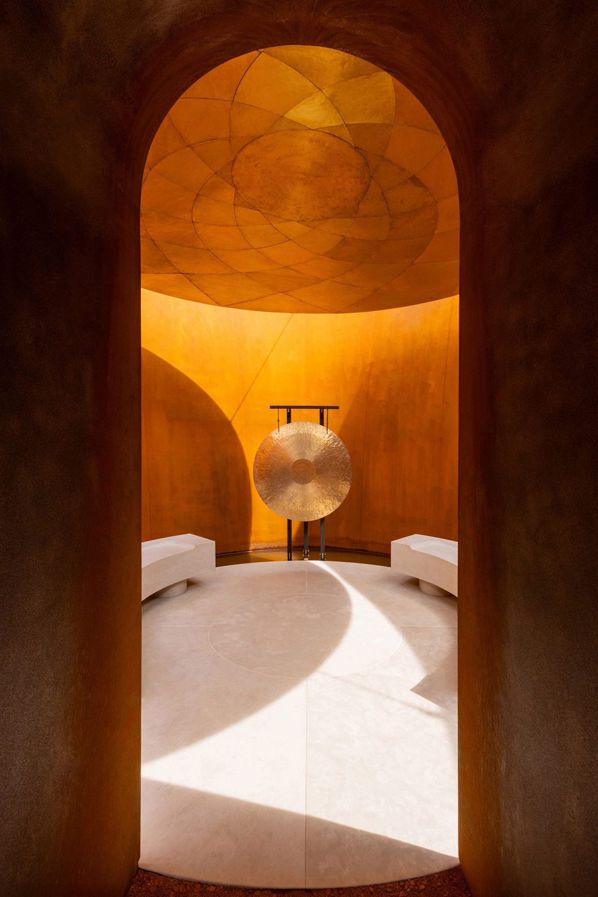 過狹窄的拱形隧道後,會進入一個凹形環狀空間,中央懸掛一面銅鑼,兩側設有半環狀石凳;上方的天花板則以手工錘製的黃銅打造,浮現出旋繞的曼陀羅紋樣,象徵能量的流動與循環,其邊緣留有細縫,使陽光、空氣與雨滴得以穿透,讓人感受到時間與自然的共在。