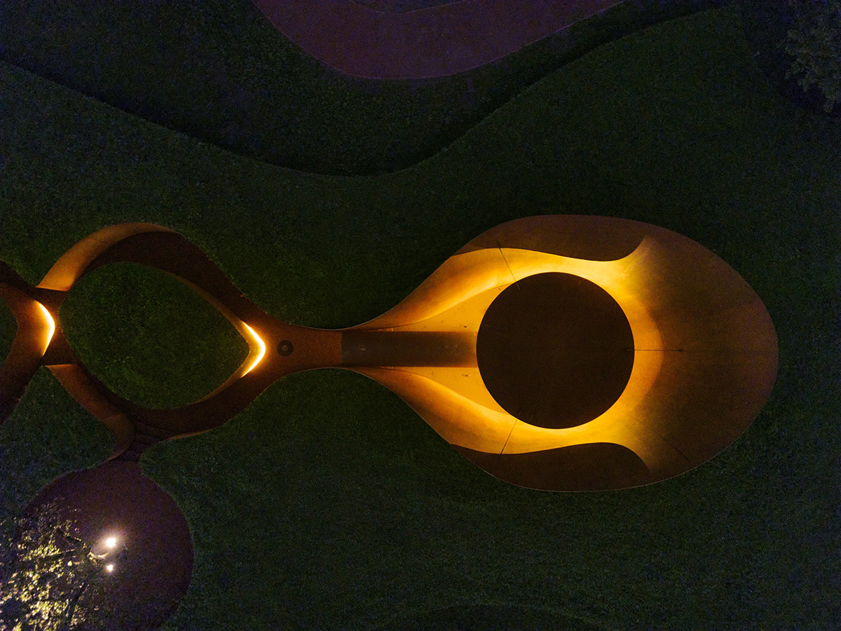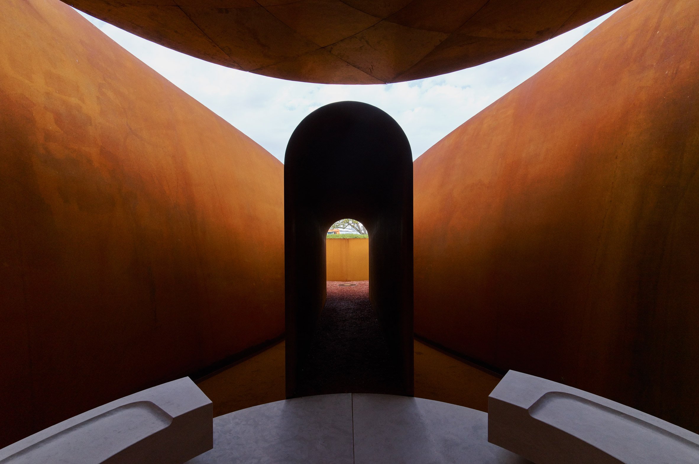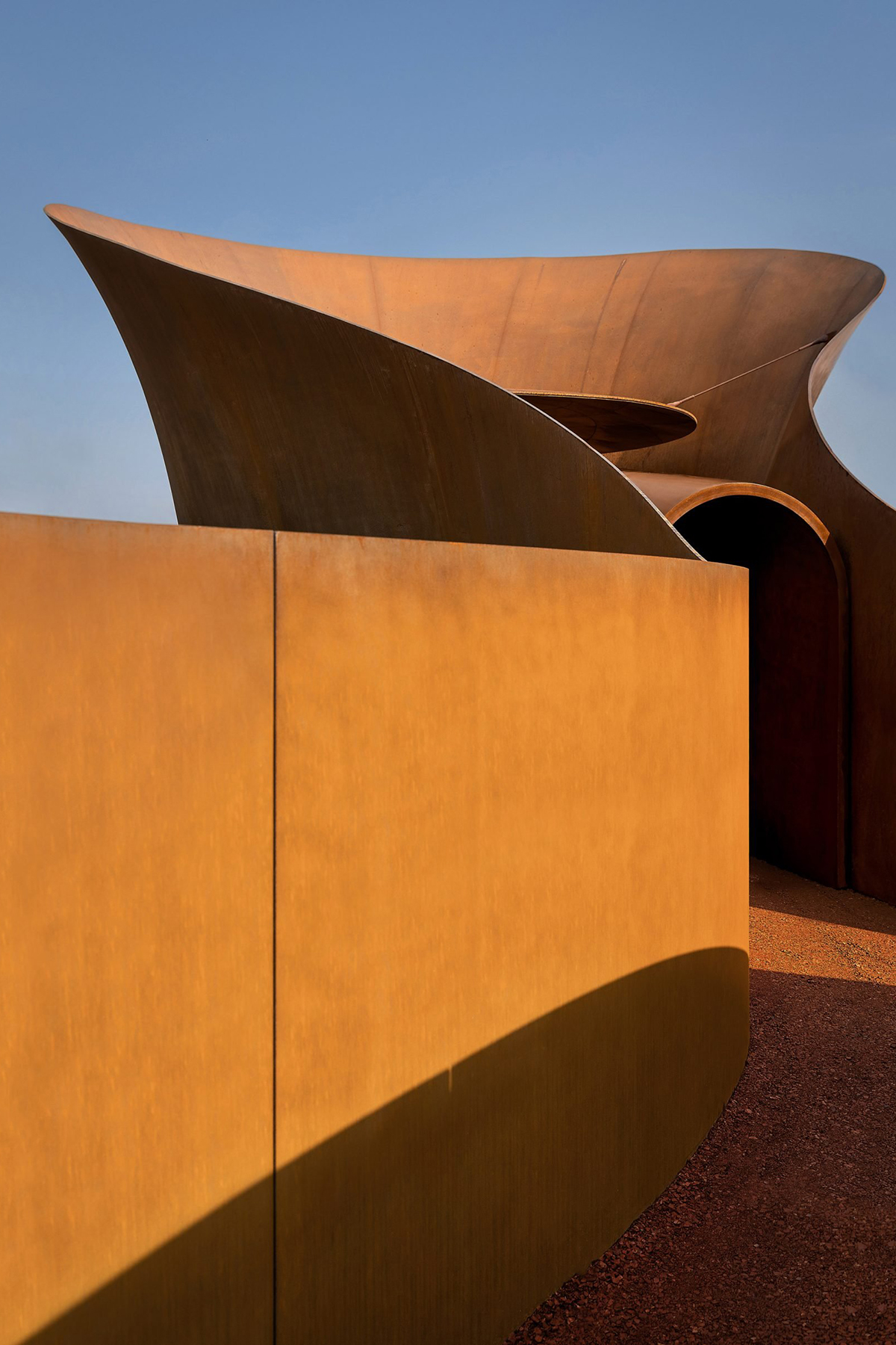 靜修所以具耐候特性的低碳回收再生鋼材 XCarb® 製成,紅棕色的表面隨時間氧化而愈加深沉,在陽光與陰影的變化下展現出多層次的表情。整體宛如一條潛入地景的蛇形通道,行走其中時,視線與草叢或樹梢齊平,彷彿身體也隨著空間一同沈澱。行進間,地面隱藏的音響系統也會播放鑼與長笛聲,輕柔的聲波引導著訪客前往核心:那座由鋼構環抱的冥想室。