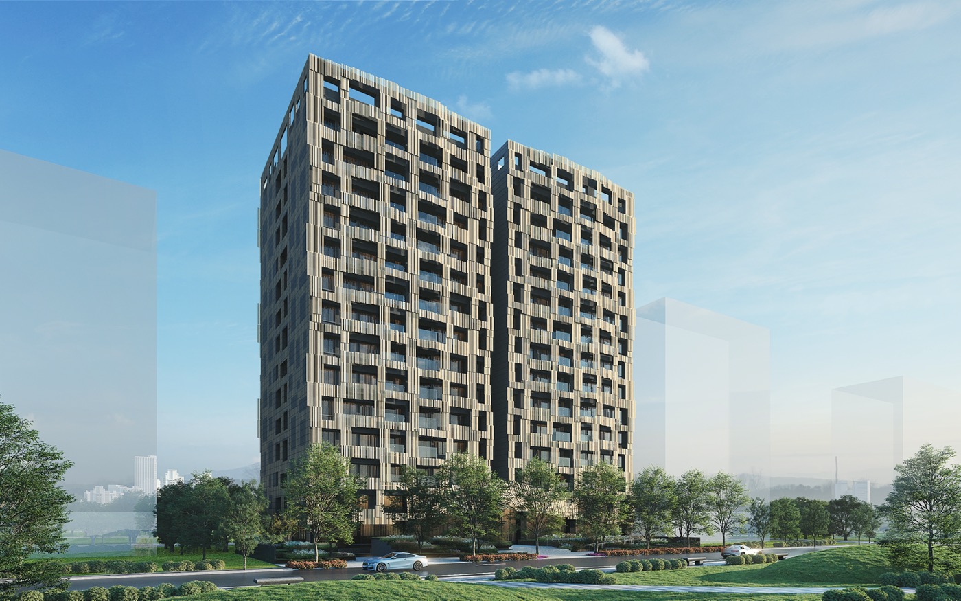 而在「義泰田境」之後,義泰建設也延續以建築為城市策展的精神,並將目光轉向新北市塭仔圳重劃區,推出全新作品「義泰信」與「義泰華」。事實上,基地所在處前身曾為老紡織廠「信華毛紡」,承載著新莊與泰山一帶的產業記憶。為此,建築師闕河彬以歷史為根源,將紡織工法轉化為立面語彙,透過五種色磚拼組出六種色階,彷彿城市布幔般在陽光下流動出靈動氣韻。