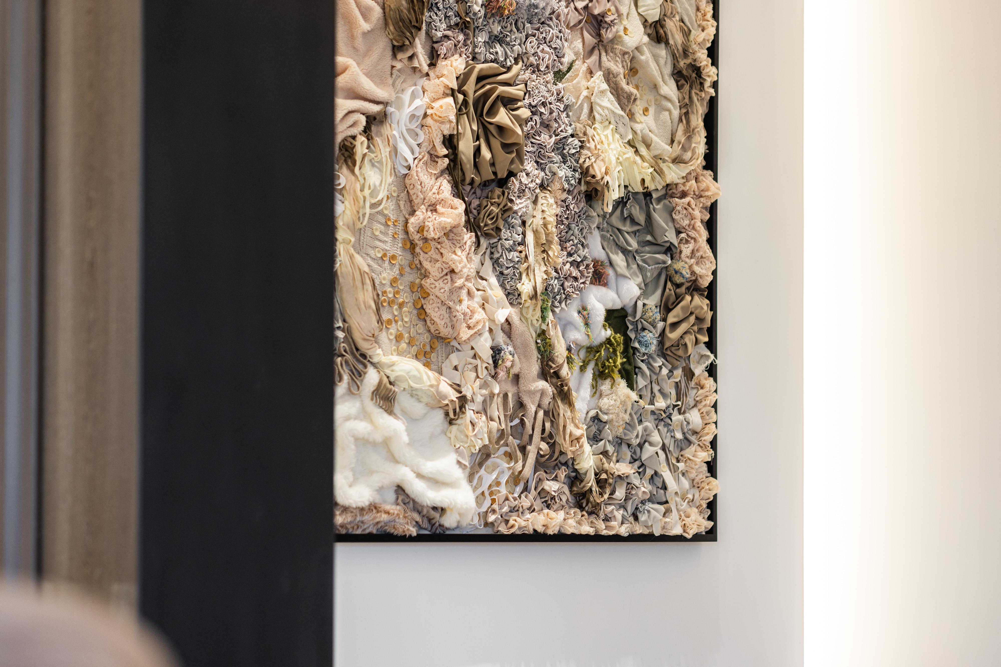 呼應這份精神,接待中心特別邀請被譽為「針織女王」的時尚設計師潘怡良,以《記憶的痕跡》為題創作藝術裝置。只見她透過編織技藝,堆疊不同材質的大地色系回收布料,不只鋪排出富有立體感與視覺層次的畫面,也展現從鮮明到模糊的記憶流動。這也讓《記憶的痕跡》不僅是藝術作品,更是一種文化書寫;而當人們走進接待中心,不只看見建築的介紹,也窺見時光的痕跡,以及義泰建設對文化的講究與心意。