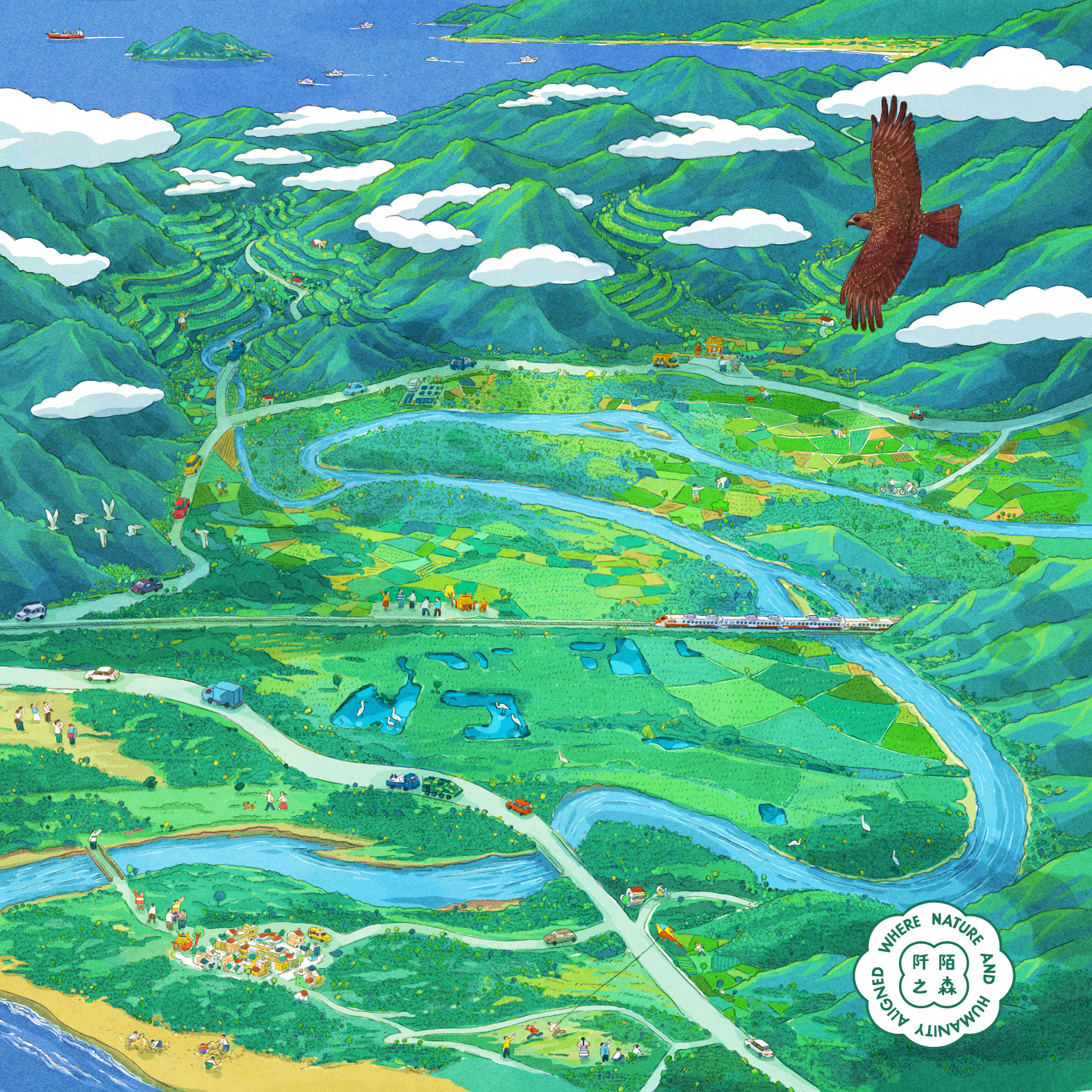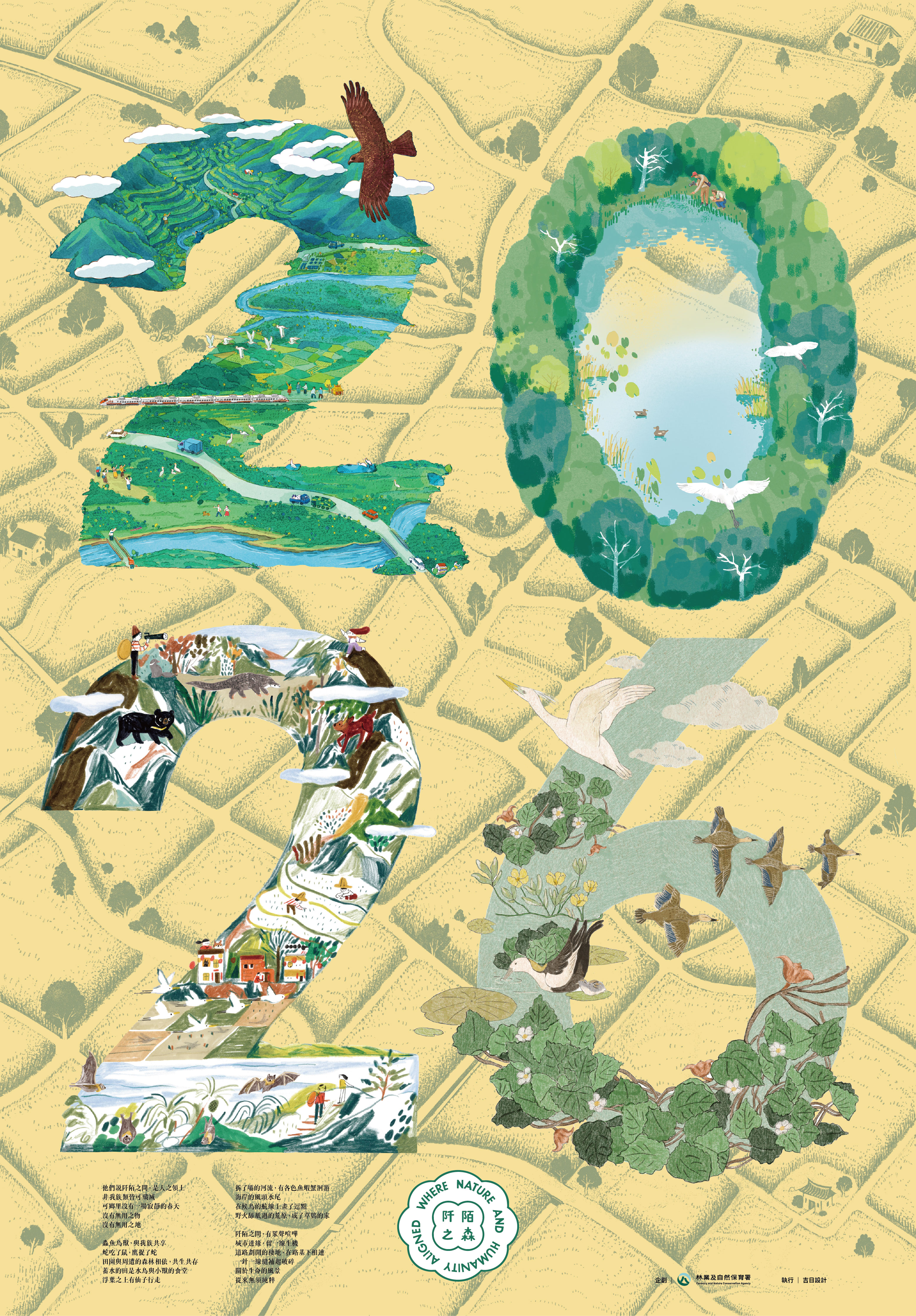 1 月〈眾生有田〉,邀請插畫家洪添賢 Croter 以黑鳶的視角,描繪東北角雙溪流域的壯闊景致。從遠處的貢寮水梯田,到近景的田寮洋濕地,畫面串起水源涵養與物種棲息的關鍵生態系,象徵人與自然共存的純淨之地。