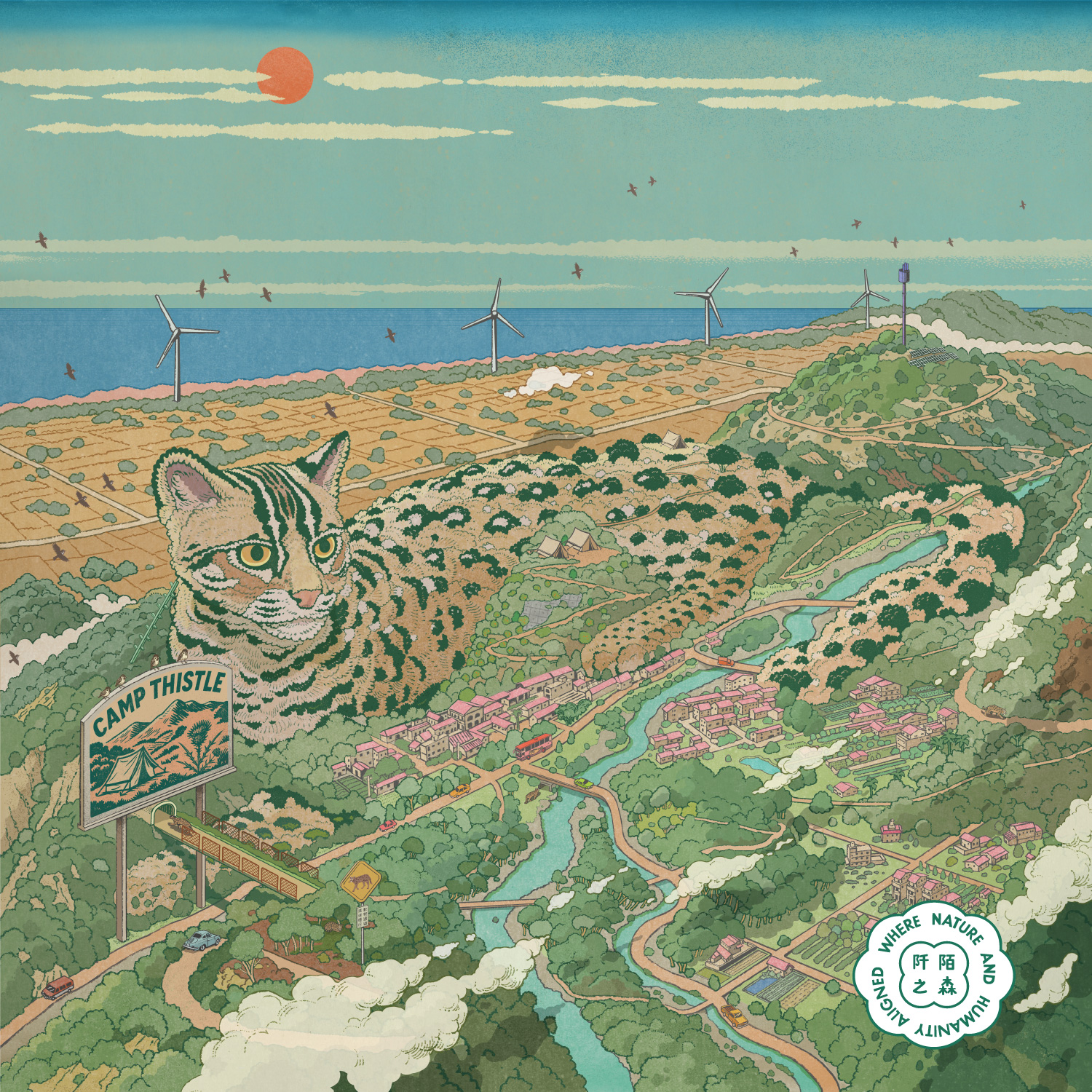 8 月〈為虎護山〉則出自鄒駿昇 Page Tsou 之手。苗南丘陵的淺山化為巨大的石虎,靜靜融入山林之間,象徵守護自然的力量。畫中可見淺山廊道、石虎警示牌與動物友善果園,傳遞人與動物共築安全棲地的美好願景。