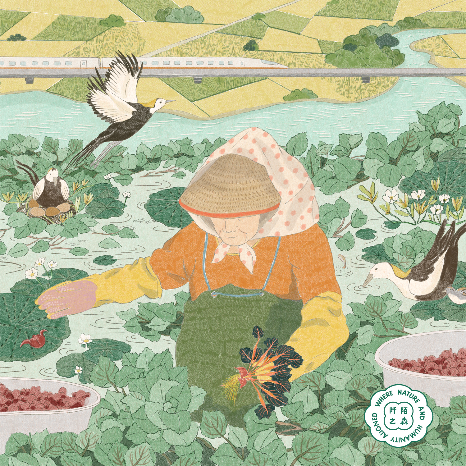 9 月〈浮葉之舞〉出自吳怡欣 Yihsin Wu 之手。畫面以農婦採收菱角的景象為前景,象徵勤勞與豐收的力量。水面上,水雉與菱角相依共生,隨風輕掠,姿態優雅如凌波仙子。俯瞰葫蘆埤,遠方蜿蜒的高鐵軌道映照出人與自然共行的節奏。水雉這種擁有修長尾羽的水鳥,常棲息於潔淨的菱角田間,在此築巢育雛,展現生態的蓬勃生命力。整幅作品以柔和筆觸與細膩光影,描繪出人與自然共生共榮的永續詩意。