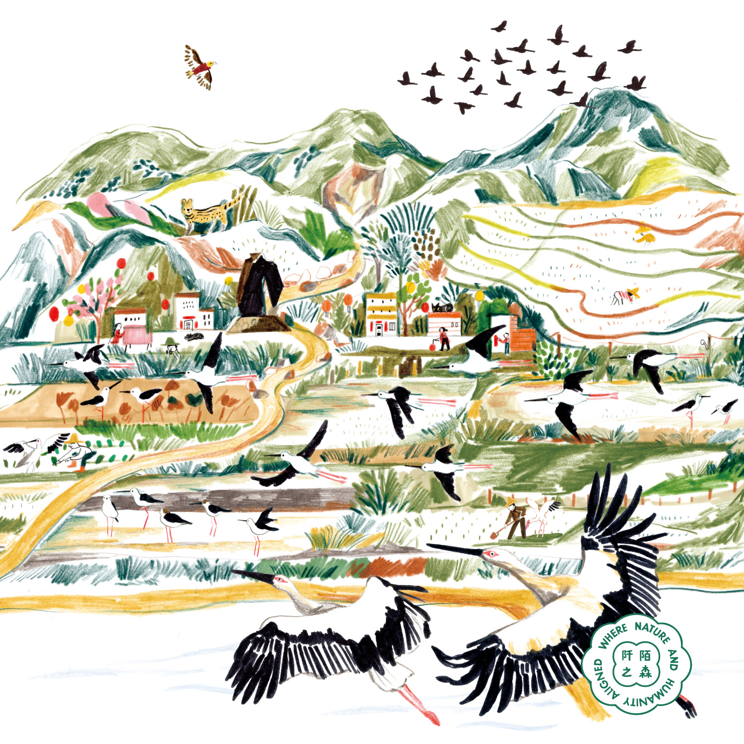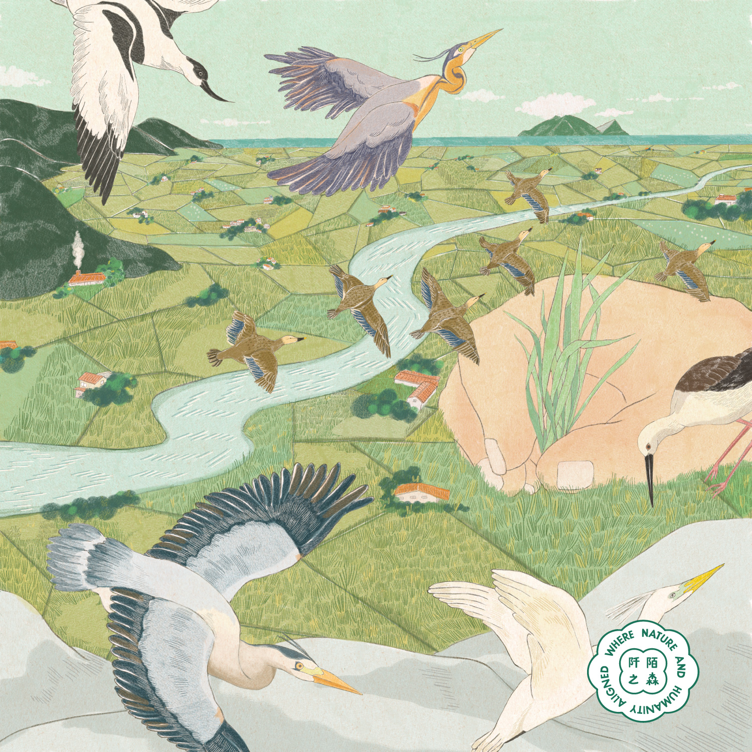 3 月〈候鳥機場〉出自吳怡欣 Yihsin Wu 之手。她以插秧的雙手為起點,描繪蘭陽平原與蘭陽溪孕育生命的節奏。每到三月,冬候鳥啟程北返,蒼鷺、紫鷺、唐白鷺、高蹺鴴在空中穿梭,彷彿機場起降般熱鬧,象徵自然永續的生命循環。