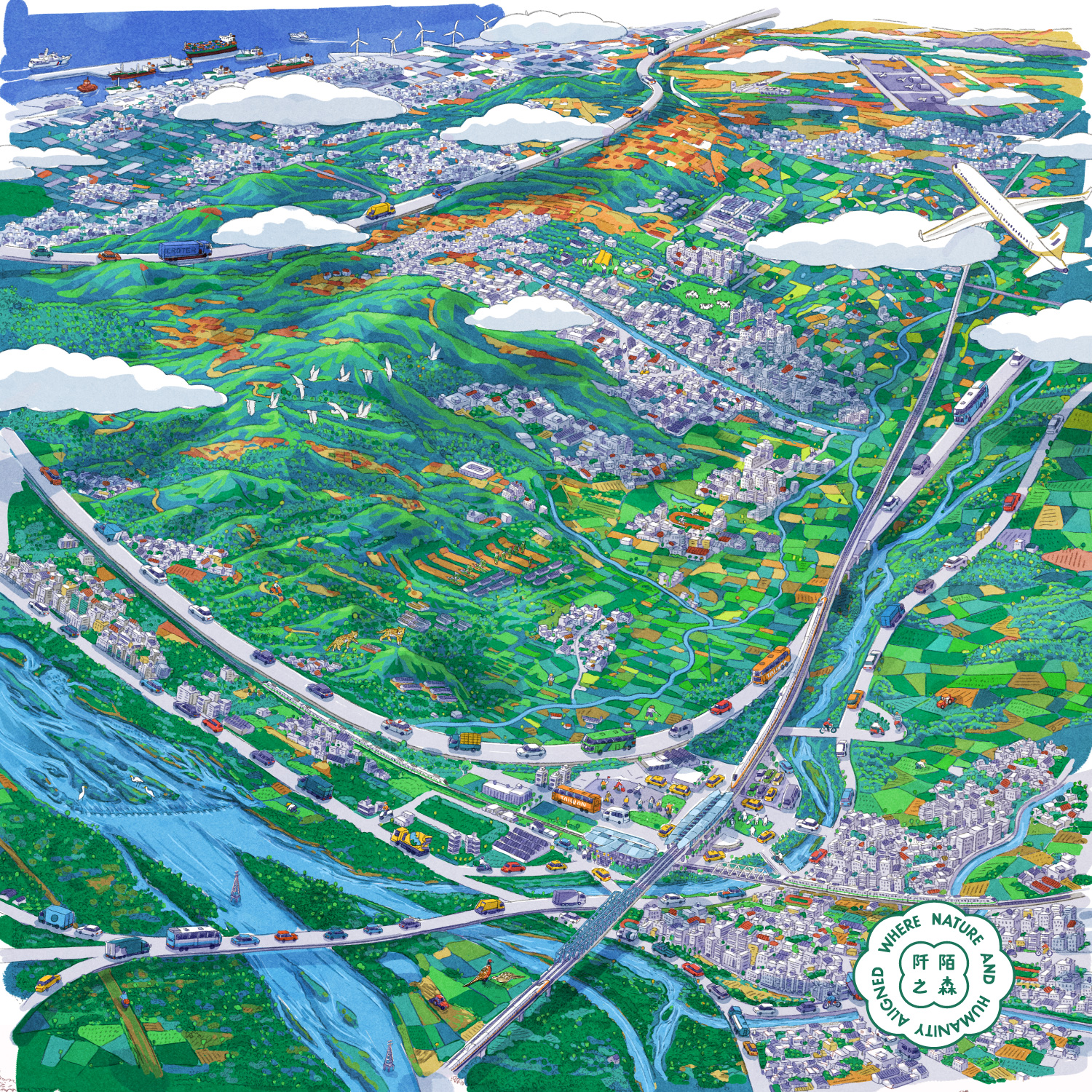 洪添賢創作的另一幅 4 月〈城中綠洲〉,花了不少時間調整視角與構圖,最終以高空鳥瞰的角度,從烏溪與筏子溪交會處向北俯視大肚臺地,描繪出城市鑲嵌於自然之中的獨特景象。遠方可見清泉崗機場與臺中港,高樓錯落於綠意之間;前景林間,石虎悄然藏身,環頸雉於田間覓食,構築出一幅自然地景與城市景觀交融共生的畫面。