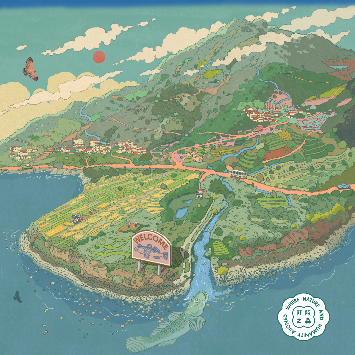 6月份〈還流於河〉由鄒駿昇創作。作品取景自新社半島外海,俯視海岸山脈,映入眼簾的是新社部落以半農半漁為主的生活景象;山腰上的復興部落,近年積極恢復水梯田耕作,拆除水壩、封溪護魚,讓洄游性的鰕虎、網球蝦與貪食沼蝦得以重返溪流。鄒駿昇以充滿想像力的筆觸,大膽描繪巨大鰕虎自加塱溪與大不岸溪洄游的奇幻場景,岸邊迎魚的招牌更為畫面增添了童趣與幽默感。