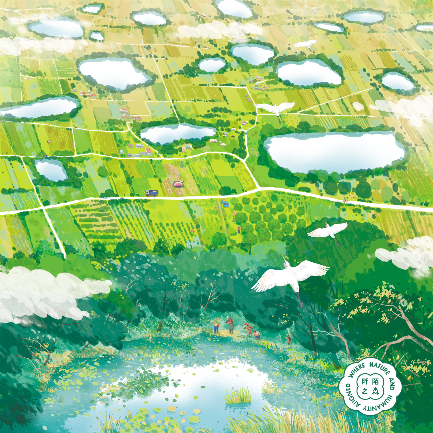 7 月〈千塘之歌〉由林家棟 Jia Dong Lin 創作,以俯瞰視角描繪桃園台地上點點星光般的埤塘。前景的高榮野生動物保護區是全臺最小的保護區,復育成果讓臺北赤蛙重新繁衍,也讓埤塘生態再度綻放生機。