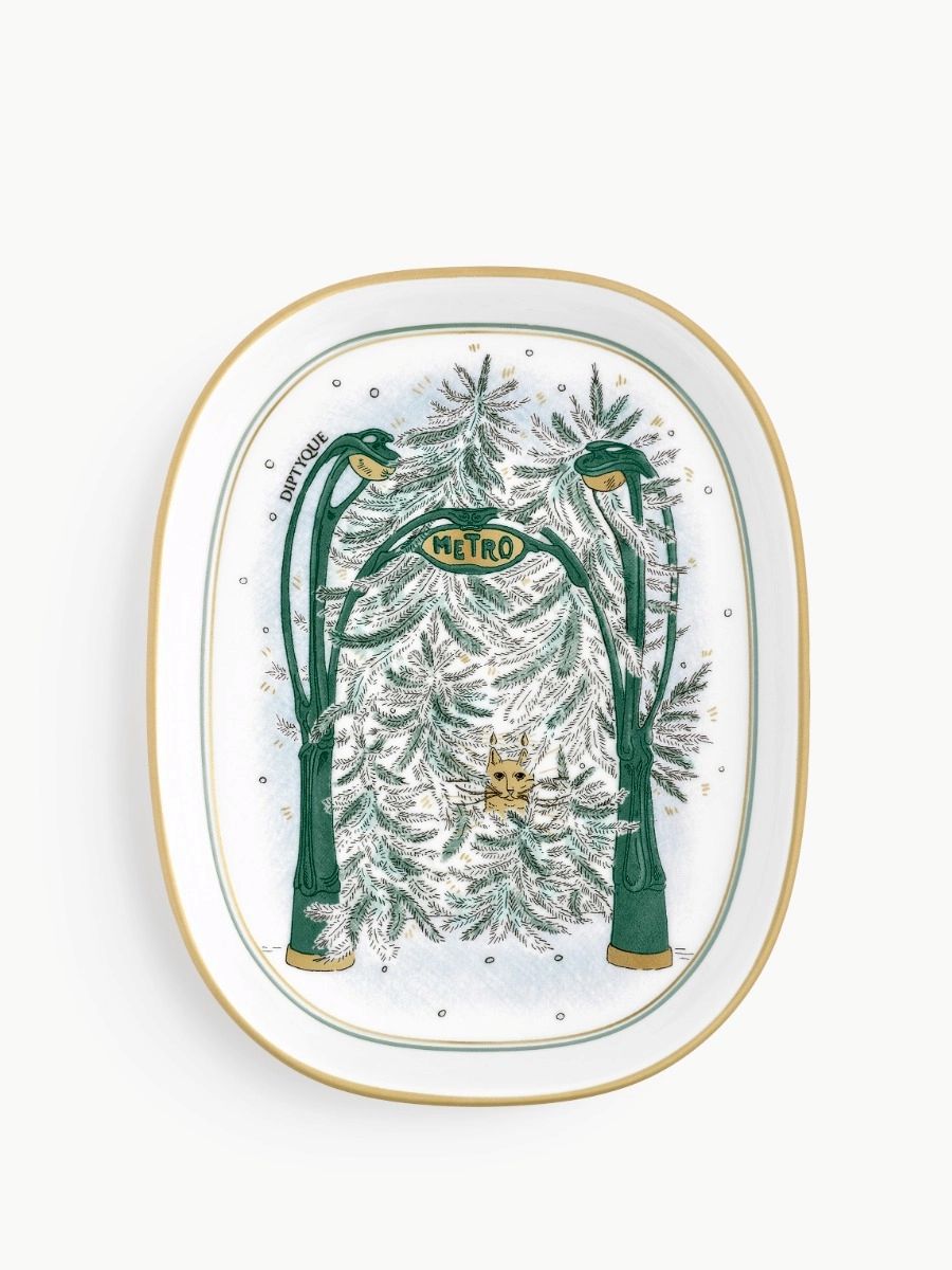 藝術家 Vincent Puente 所繪的超現實插圖就出現在其中一款橢圓托盤上——畫面是一座巴黎地鐵入口前的松樹林,彷彿故事場景穿越至現實。