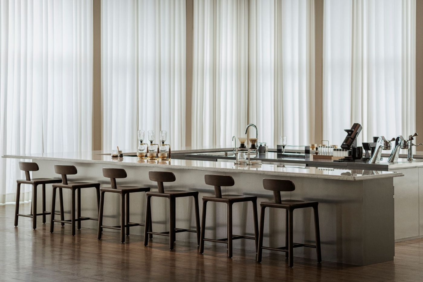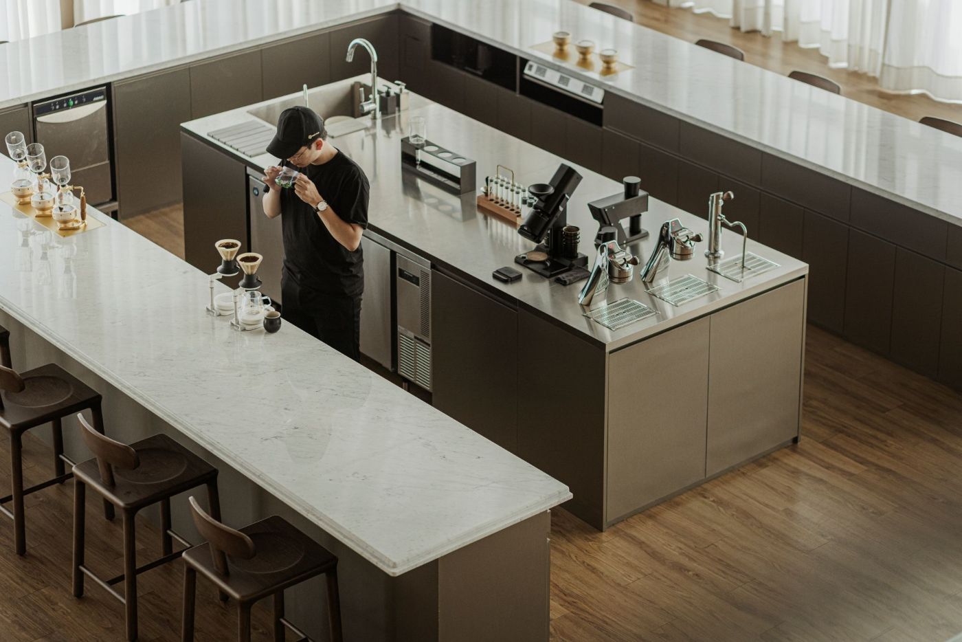 中島區配備頂級義式機與磨豆機,可進行義式、手沖、虹吸與創意調飲等全方位演示;長高吧檯則為風味研究而設計,其高度方便嗅聞與比較,使風味探索更聚焦且精準。「這樣的設計,是為了讓風味研究更有效率。」創辦人 Joseph Brodsky 表示,關於咖啡的學問與創意在此能無盡水平與垂直地延展開來。