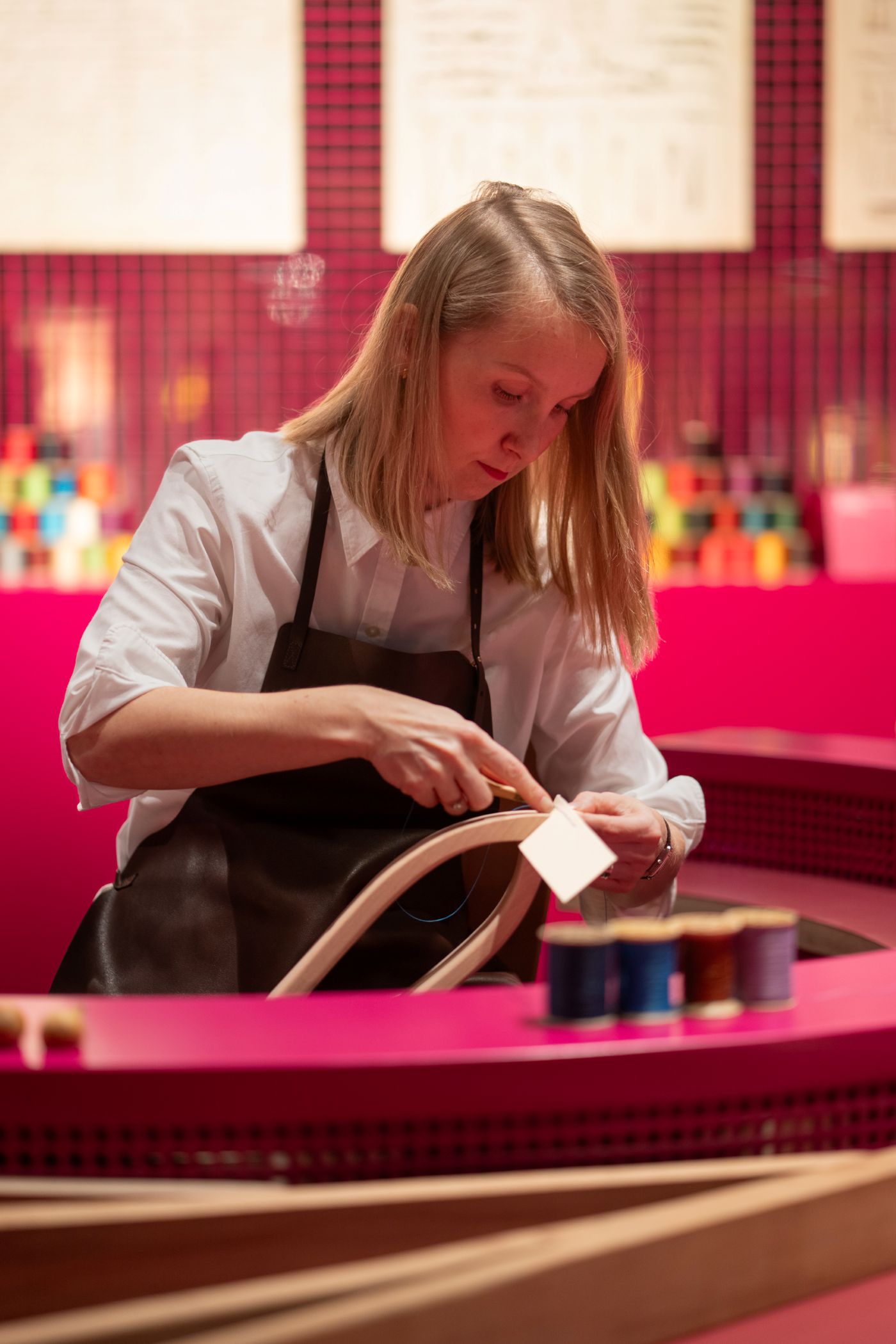 本次展覽空間以工匠工作台為靈感,透過開放而溫暖的動線呈現四大主題:工藝的保存與傳承、對材料的尊重與品質追求、對長期承諾的堅定實踐,以及與地方文化的深度連結——這些價值共同構築了愛馬仕的品牌基石。