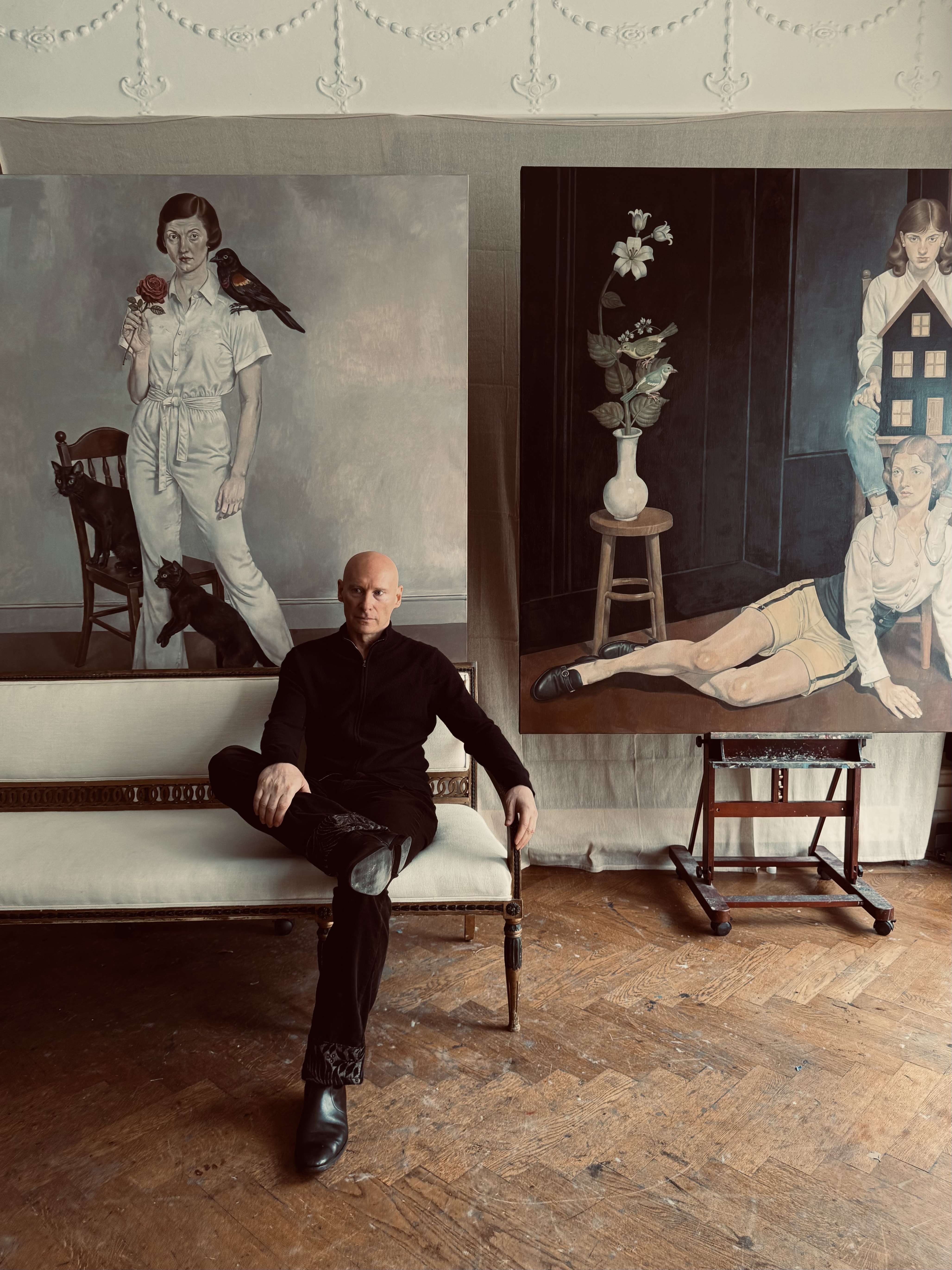 他透過訓練 AI 模型,使其吸收自身創作的視覺結構與語感,生成圖像後,再親手以油畫技法細膩重繪,發展出融合筆觸與演算邏輯的獨特美學。這些作品兼具精緻與張力,結合歷史典故、當代語彙與超現實意象,探討科技與人文、權力與尊嚴、觀看與性別等多重議題,同時回應當代人對自由與自我認同的深層渴望。