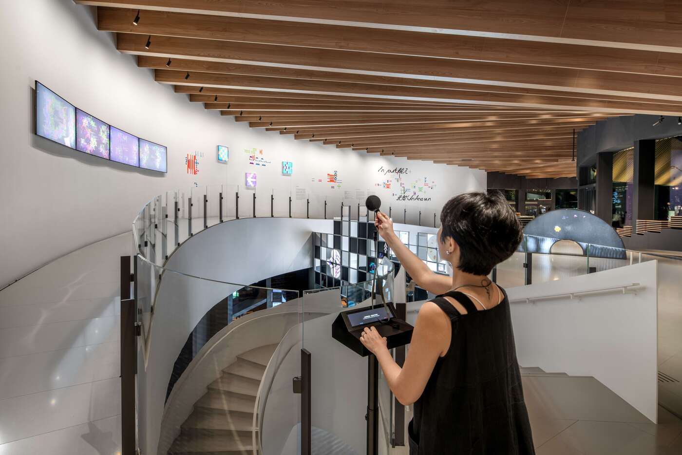 從視覺宇宙轉入暗黑場域,〈海境:回溯 Tender Soul of Ocean: recall〉由 何理 WHYIXD 攜手德國聲音實驗室KLING KLANG KLONG共創,以勤美術館戶外的氣候資料與人流數據為素材,轉譯成流動的光影與聲音。