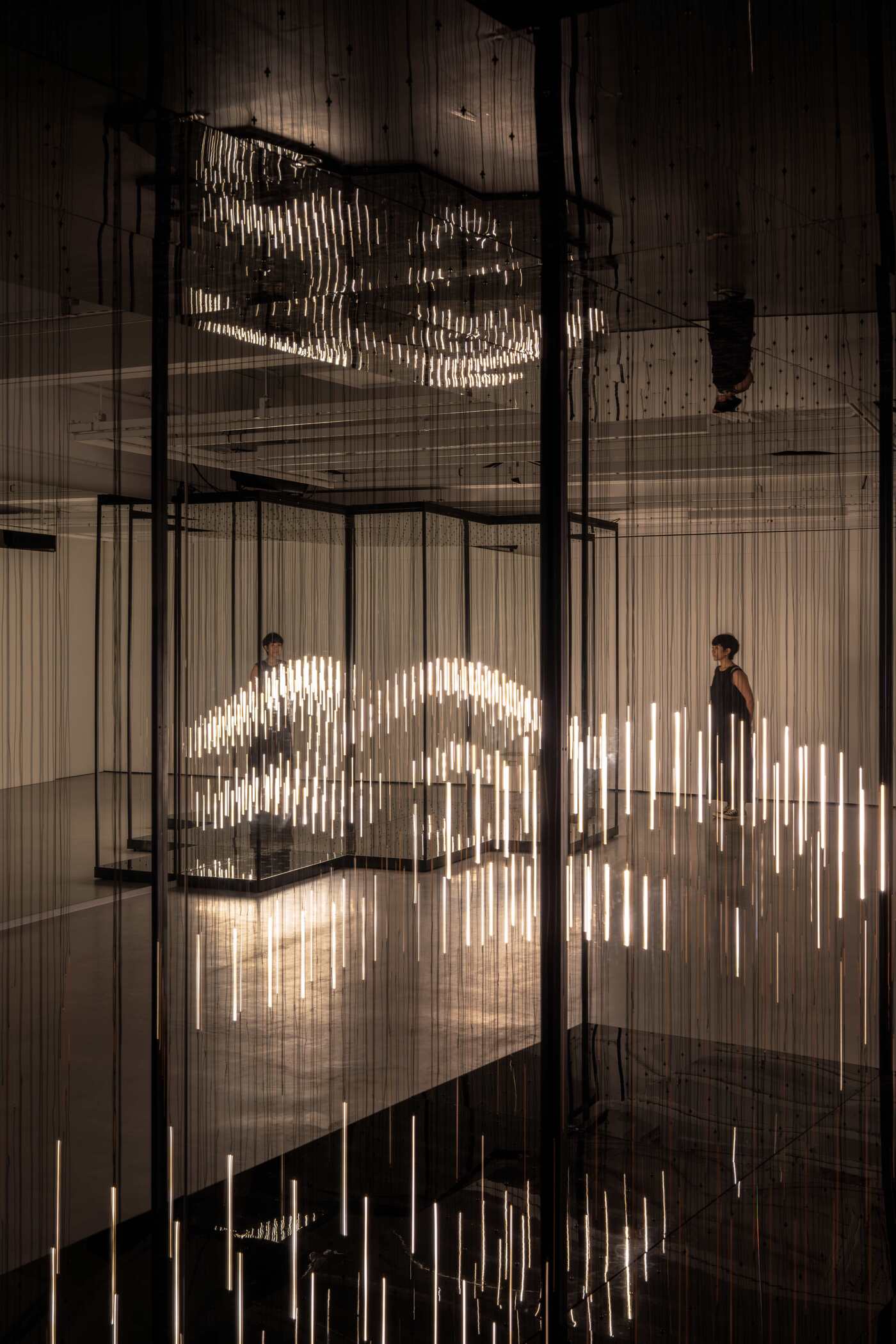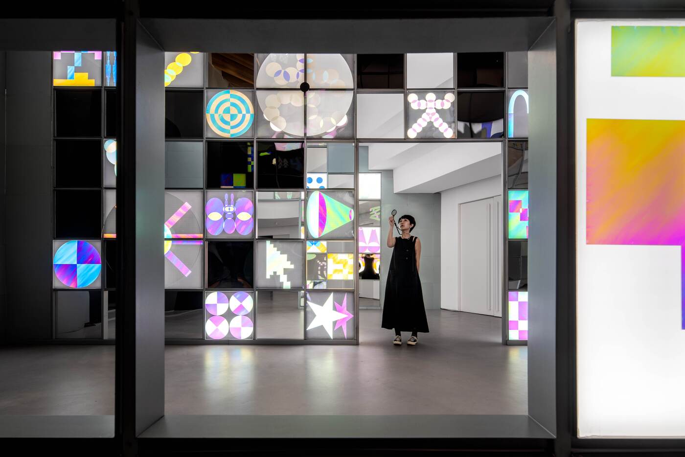 順著階梯走入地下一層,壯闊的〈像素力場Dynamic Field〉以流動光影迎面而來。由偏光鏡面、旋轉機構與燈光交織而成的巨大裝置,構築出可步入的七公尺高「像素矩陣」,隨著觀眾的移動與視角改變,潛藏色層與反射光譜層層顯現。靜止的結構在觀看中流動,鏡面折射出觀者與環境的互動,使「身體」成為影像生成的一部分。觀眾除了欣賞更也是畫面的一部分——每一次轉身、每一次呼吸,都與空間即時共振。讓光成為媒介、感知成為動力,模糊了虛擬與真實的界線,開啟一場關於影像與自我之間的沉浸對話。