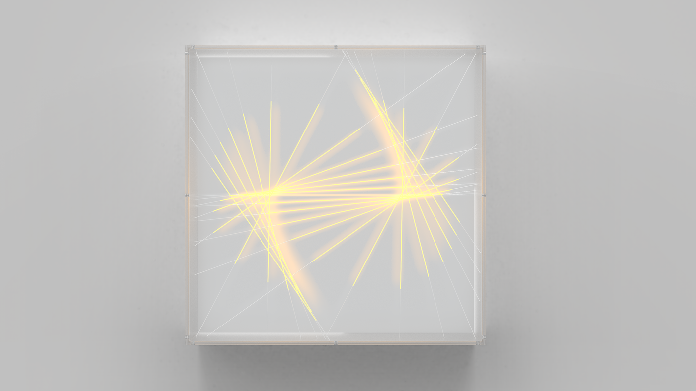 展覽自一樓入口〈Hello World〉啟動,拿起本展入場通行證:現場特製「偏光鏡」,觀展民眾親手解碼隱藏於牆面光影之間的訊息。隨著鏡片旋轉,光的偏振方向改變,潛藏的線條與色層逐一顯現,觀者彷彿化身為指令輸入者,透過手勢與視角開啟個人化的光影界面。〈Hello World〉走廊以電腦語言與互動機制設計,透過每日投票「Accept/Deny」參與展覽程式,感受思考轉化為光的瞬間。這是一場從身體出發的「開機儀式」,光影之門正式開啟。