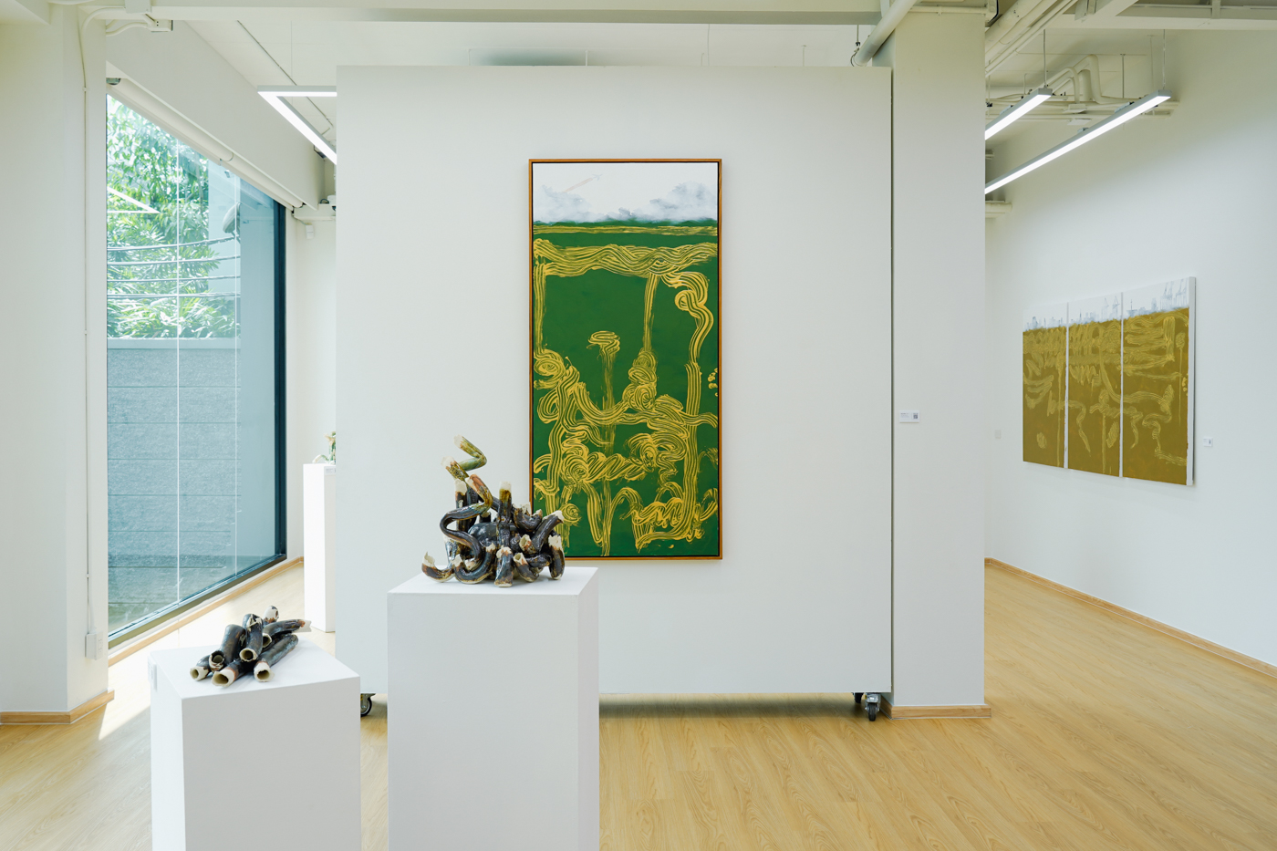 對蔡坤霖而言,繪畫中的時間是被壓縮的;雕塑則像結晶,擷取聲音片段,每個端口與裂縫都暗示聲音的流向與出口。雕塑的空洞像在默默「跑聲」,觀者的想像成為重新播放聲音的方式。「雕塑對我來說是凝固的聲音,它是動態的,只是我們無法用耳朵去聽,但也好,不然展場就吵死了。」