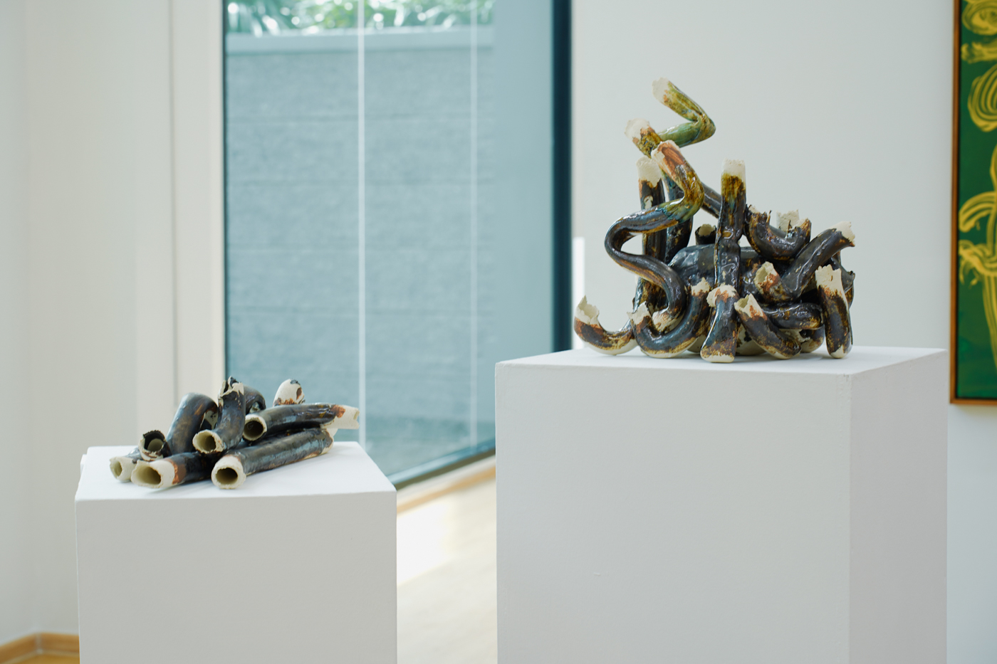 在《湄南》展場中,可以見到陶管雕塑呈現出扭曲蜿蜒、直豎分岔的有機形態,這非任意的造型,而是經過錄音、素描、雕塑的多重轉譯。蔡坤霖將聲音的「空間性」視為聽覺與視覺的共同語言,雕塑線條便構成一套「聲音的語法」。