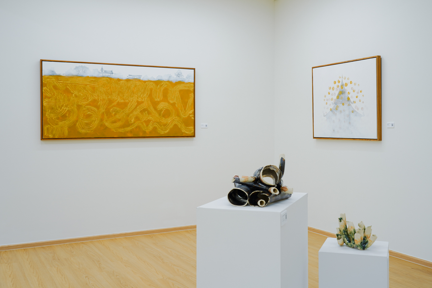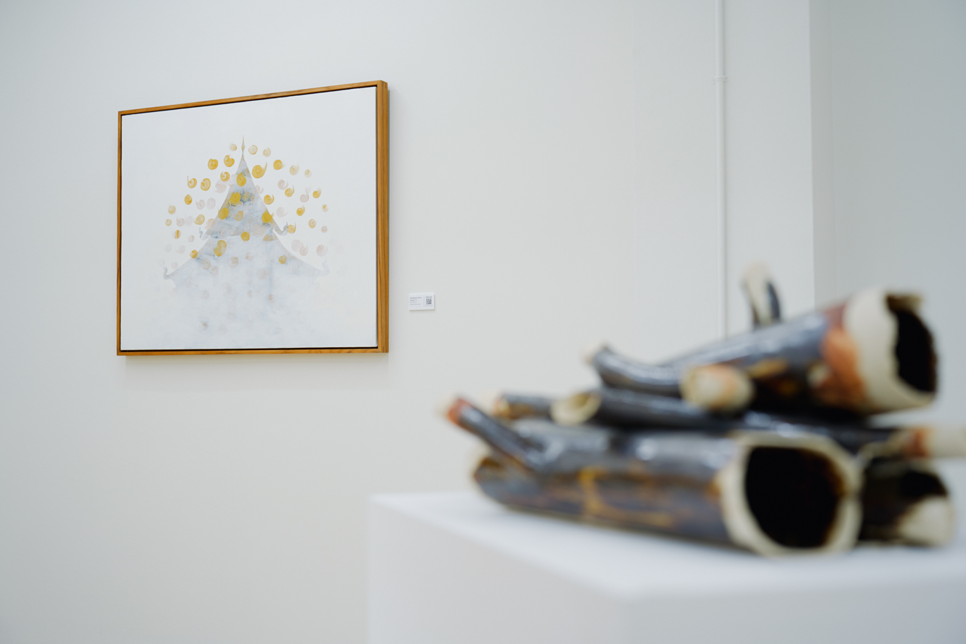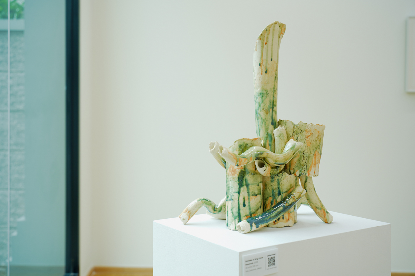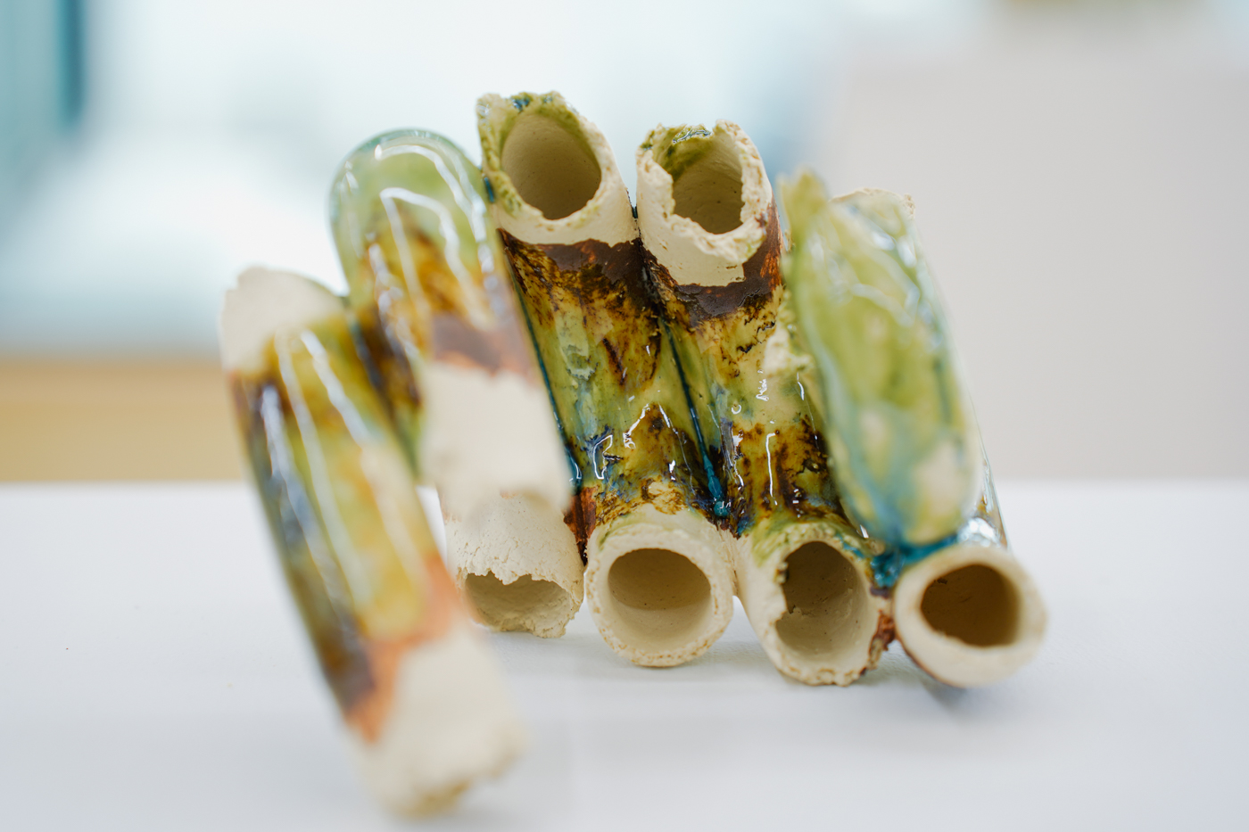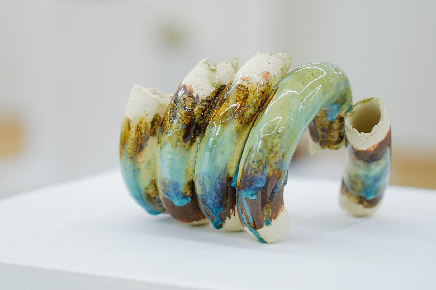 更關鍵的是,土皆取自錄音地點附近的土壤,經過採集、脆化、淘洗,再塗覆與成形,釉色則呼應河水的潔淨狀態。這一流程把聲音與土地連結起來,材料本身成為聲音與土地的共振,使每件雕塑不僅是聲音的抽象,也是地質、化學與工藝偶然性的凝聚。