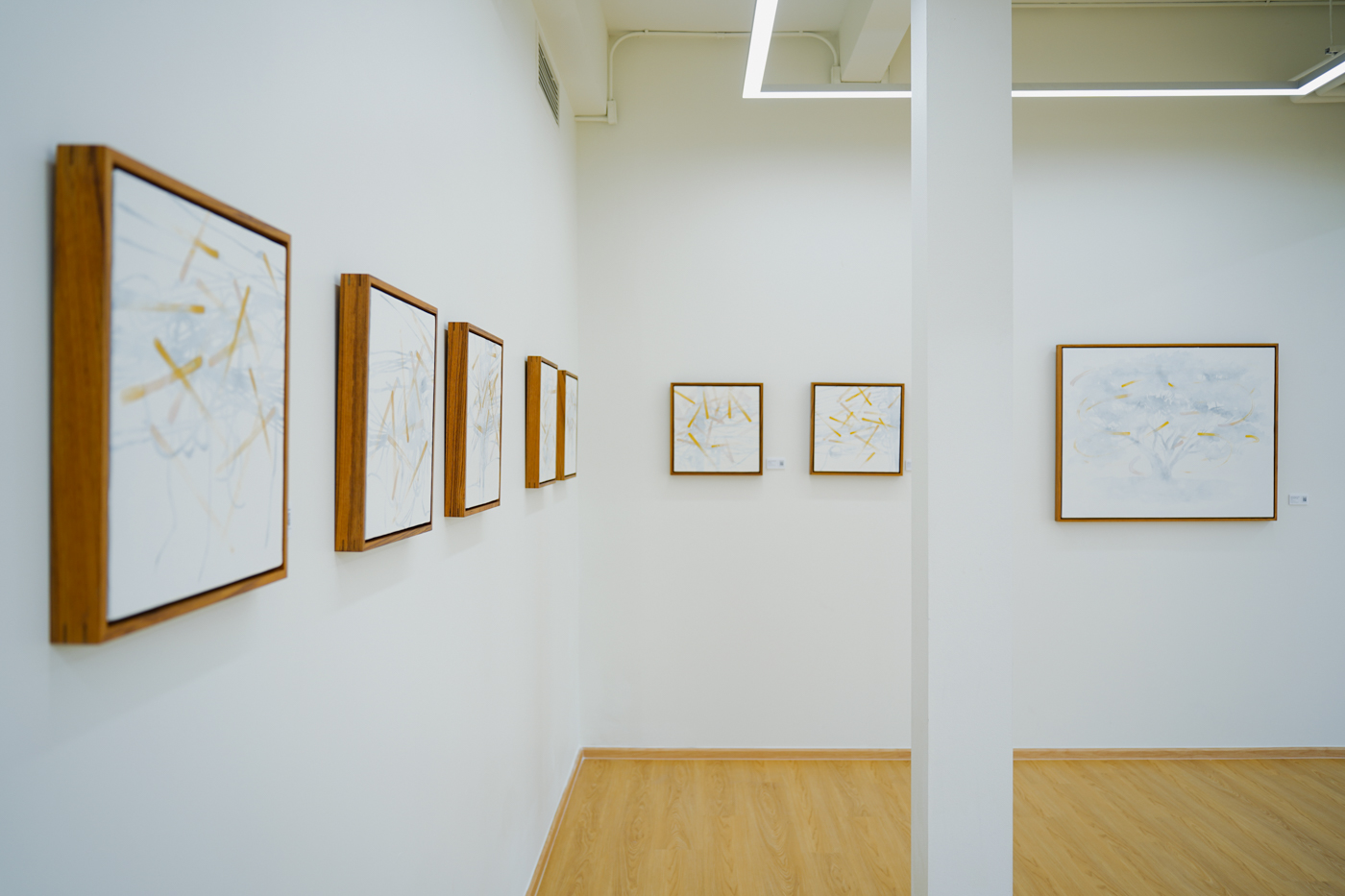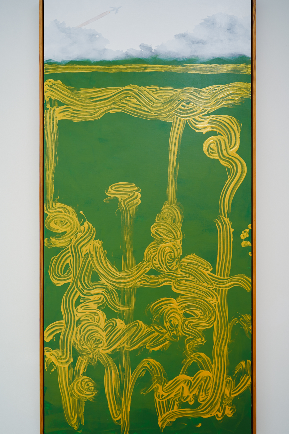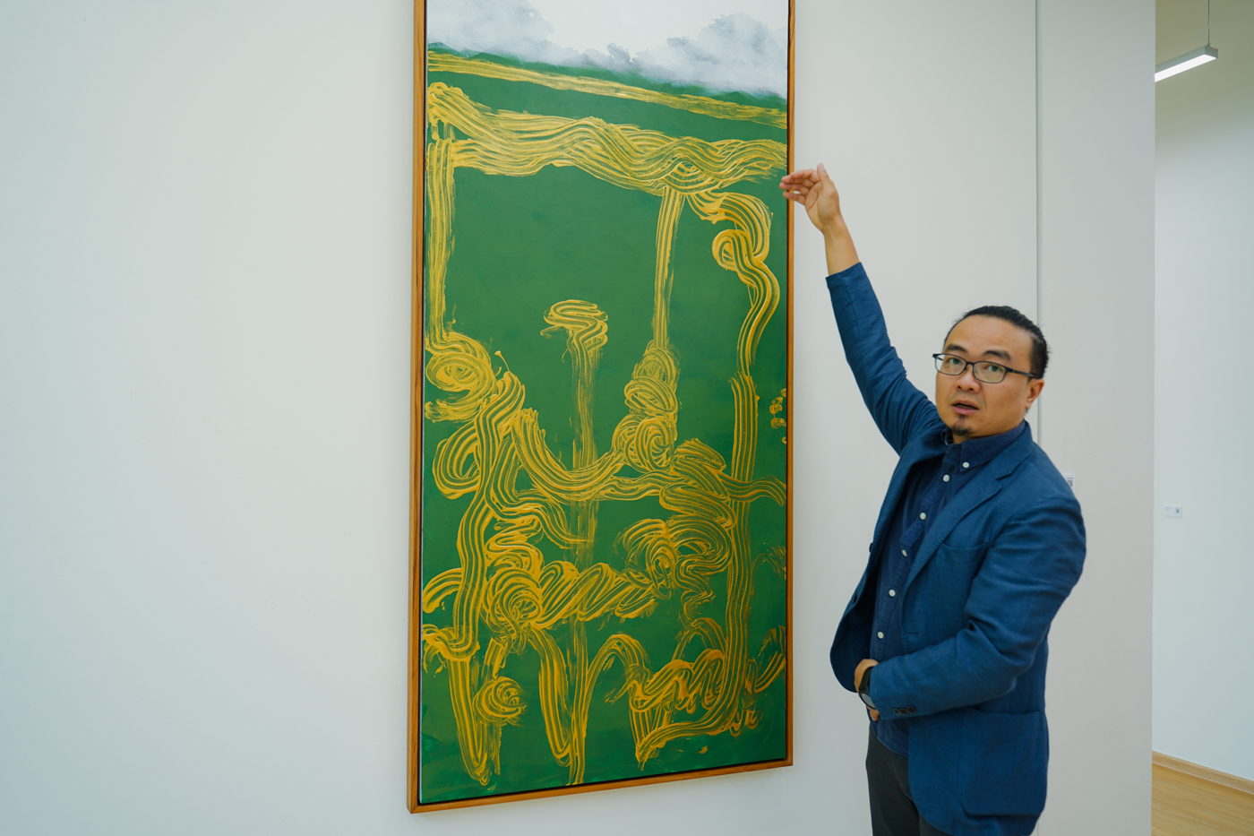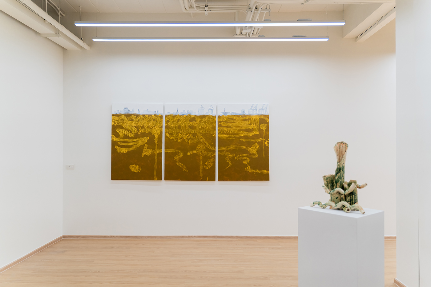 繪畫作品則展現了聲音的另一種時間性。在《安卡奧 Ang Kaew》中,蔡坤霖以手指作畫,金色筆觸標示時間的層次:畫面底部對應最早錄到的聲音,上層則為序列的最後。聲音的線性時間被轉為垂直堆疊,觀者可以在視覺上「讀取」時間的流逝。