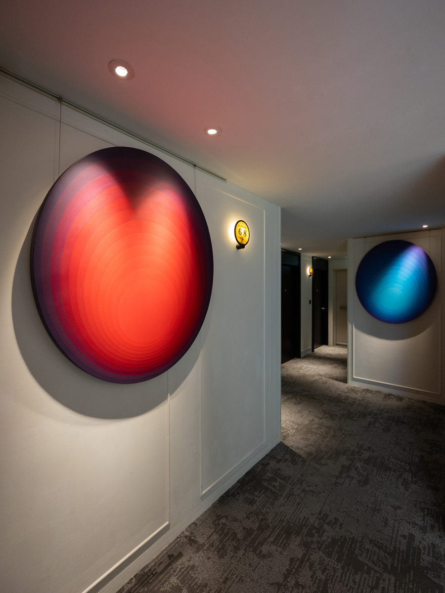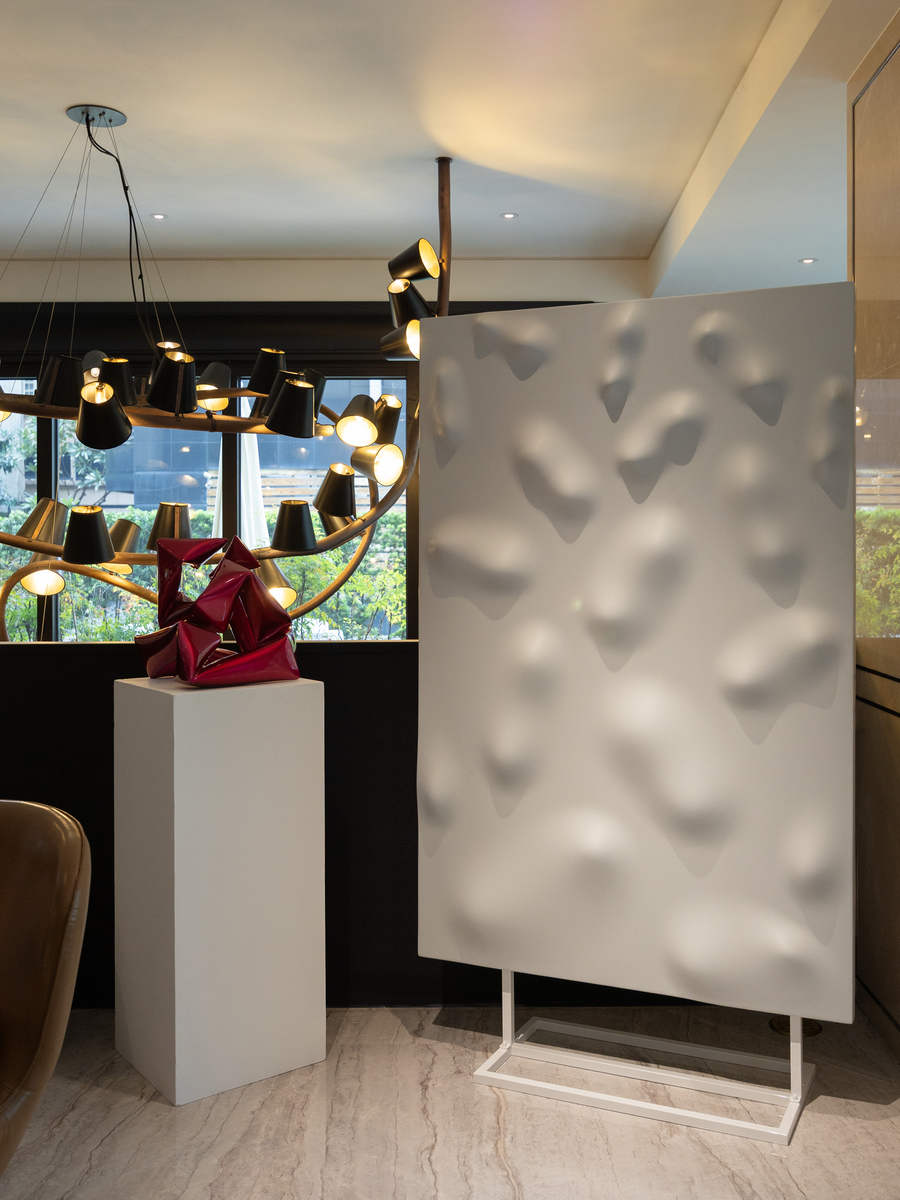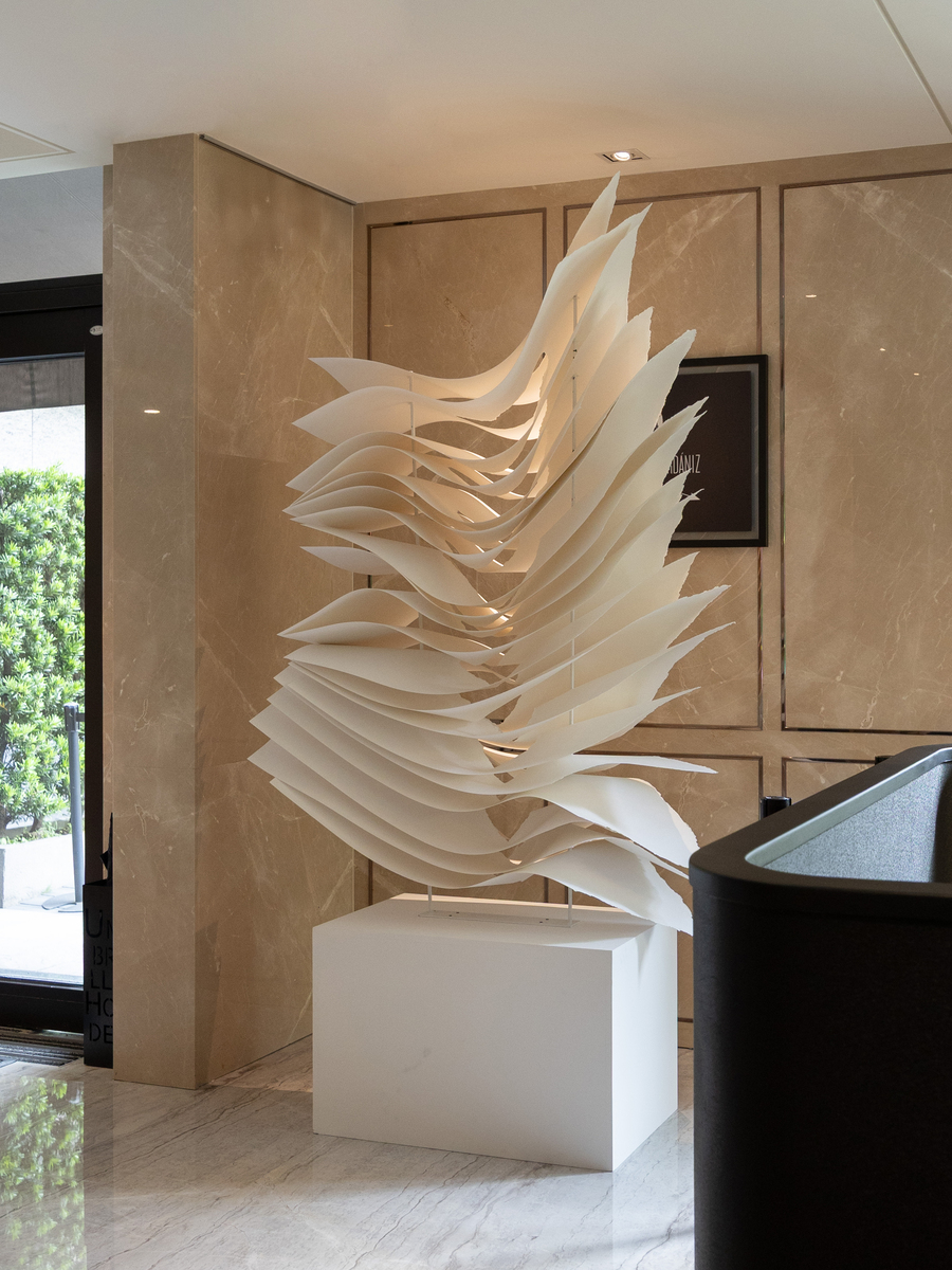 本次《白玉》集結來自瑞士、阿根廷、法國、捷克、德國、西班牙、美國、加拿大與中國共 18 位藝術家,展出共 50 件作品,分布於酒店大廳與各層廊道,使每一次步行都像穿越光影的變奏。手撕紙、金屬與木材等多元媒材的紋理在空間中相互呼應,緩緩勾勒出白色那純淨、深邃、柔韌與沉靜的多重面向。