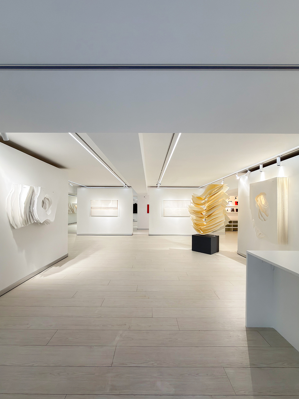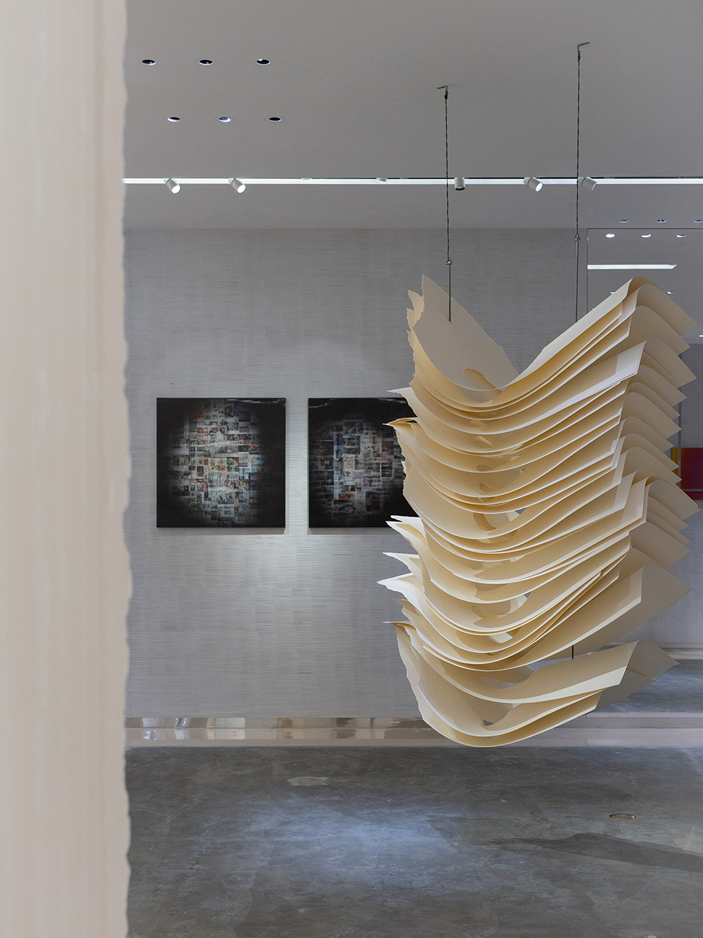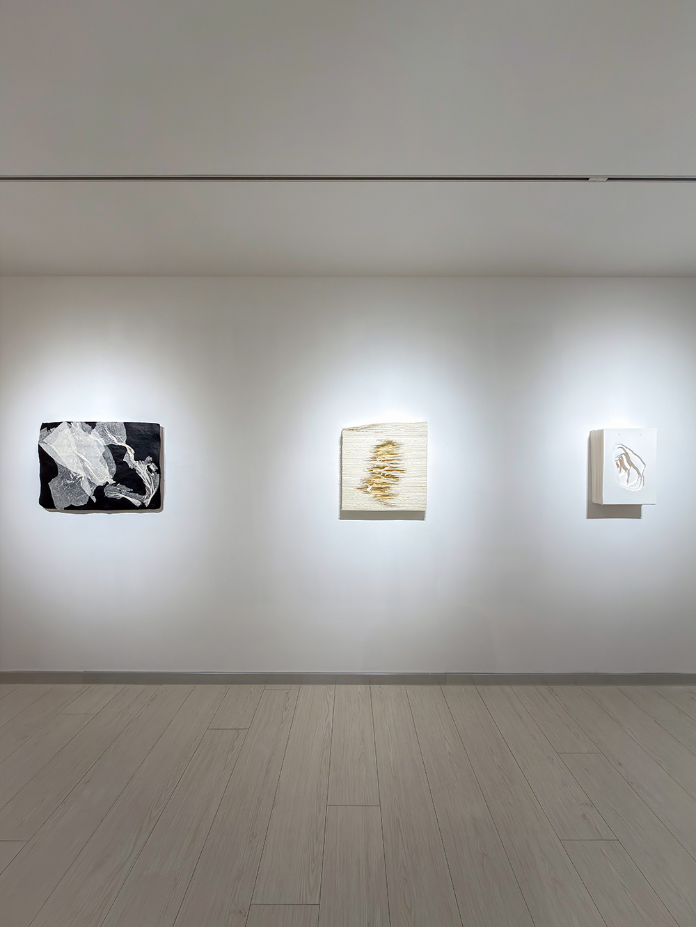除了《白玉》群展,另兩檔展覽也從不同面向延伸出對白色的思考。《白境—紙的三人展》於 Bluerider ART 台北·敦化展出,由曹吉岡、安格拉‧格拉札與湯嘉欣以紙為核心媒材,透過徽紙、工業紙、韓紙、綿紙等質地,以及三遠法、手撕紙與刺紙的技法,使紙纖的邊緣、折痕與光影成為思想與感知流動的容器。