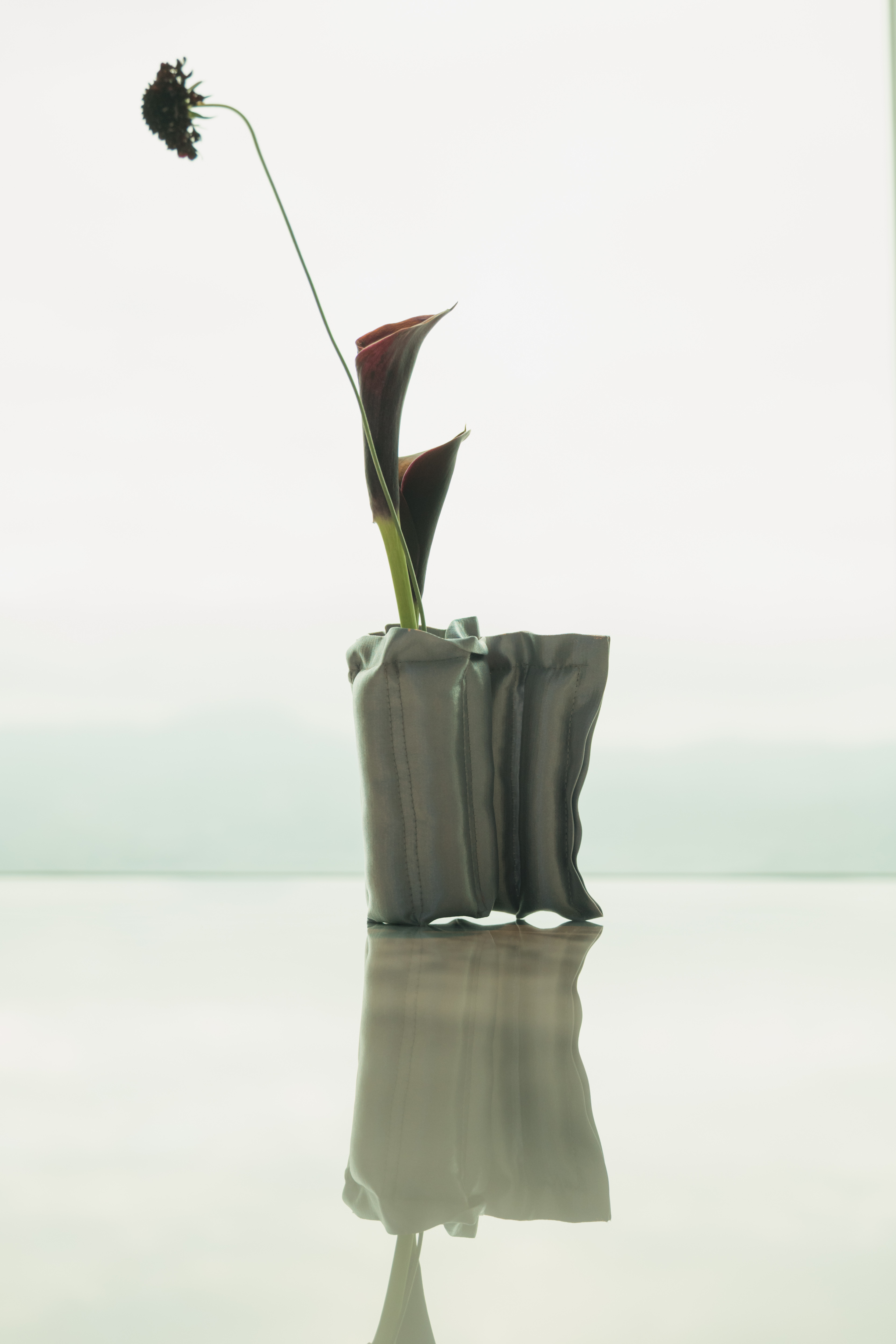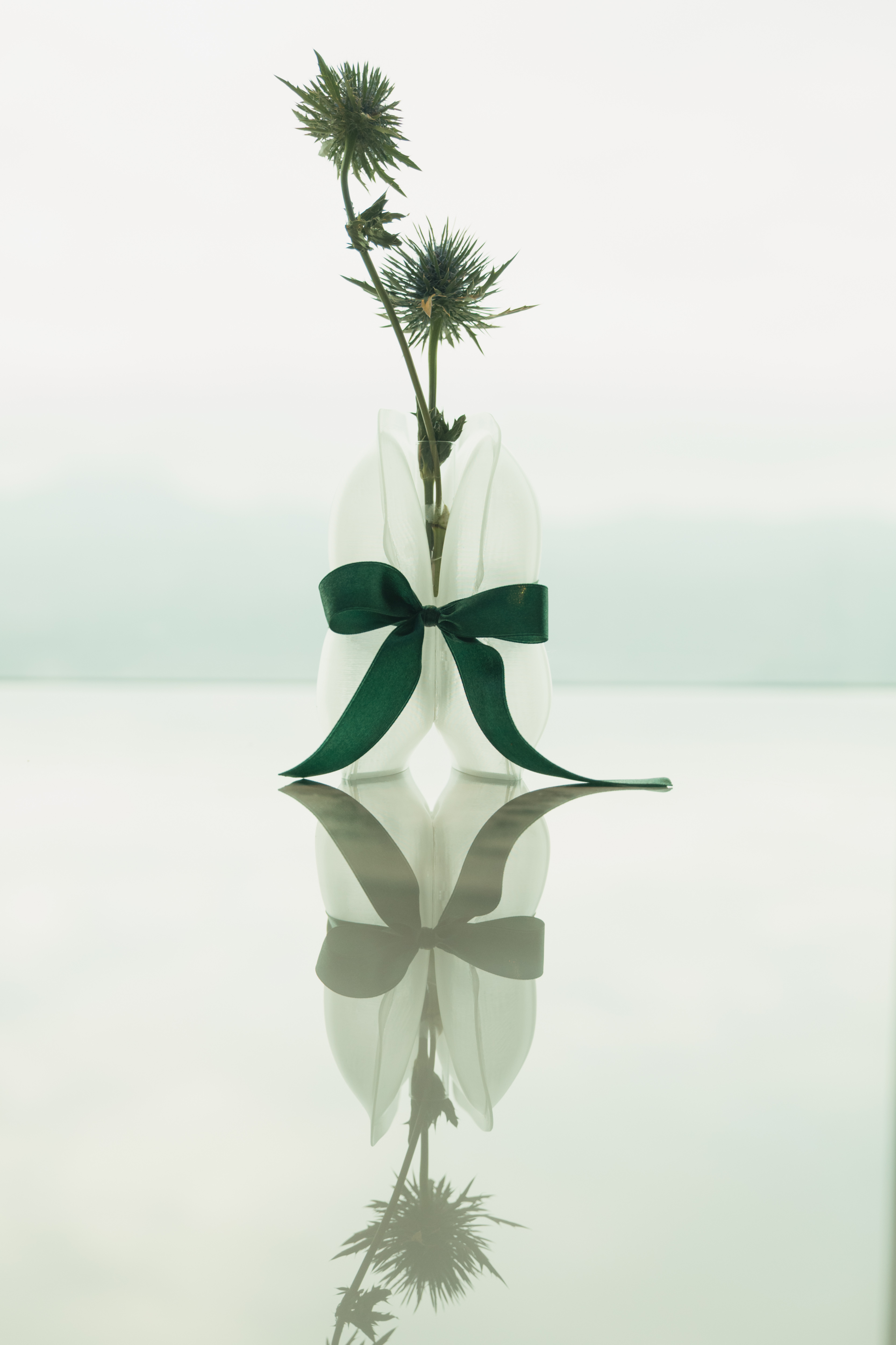 桌面裝置延續「重生」的概念,選用回收塑膠瓶抽絲製成透明纖維,再以 3D 列印製作花瓶容器,搭配 CN Flower 的選花呈現。輕盈的線條象徵材料循環的過程,也呼應作品想探討的「延續」。