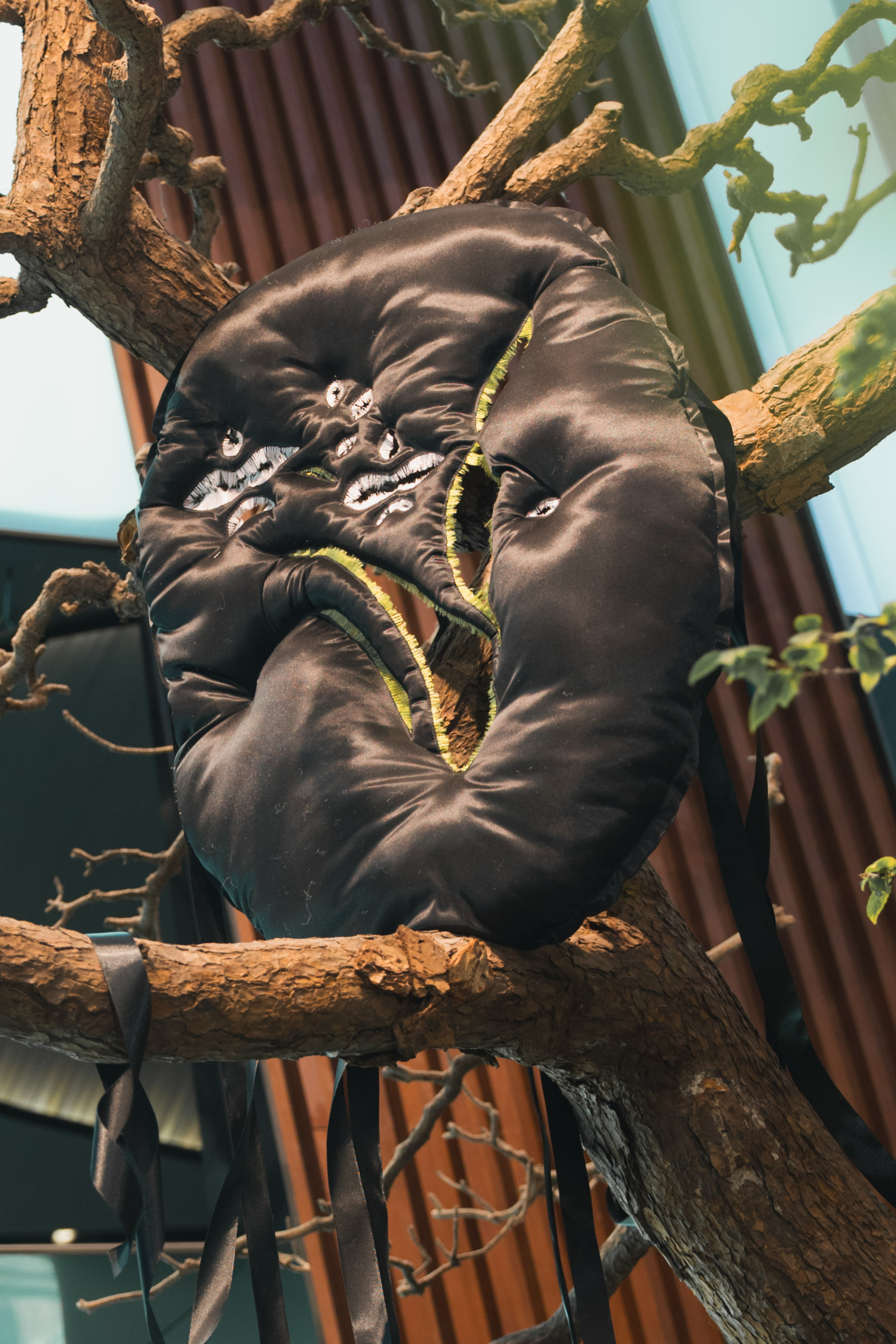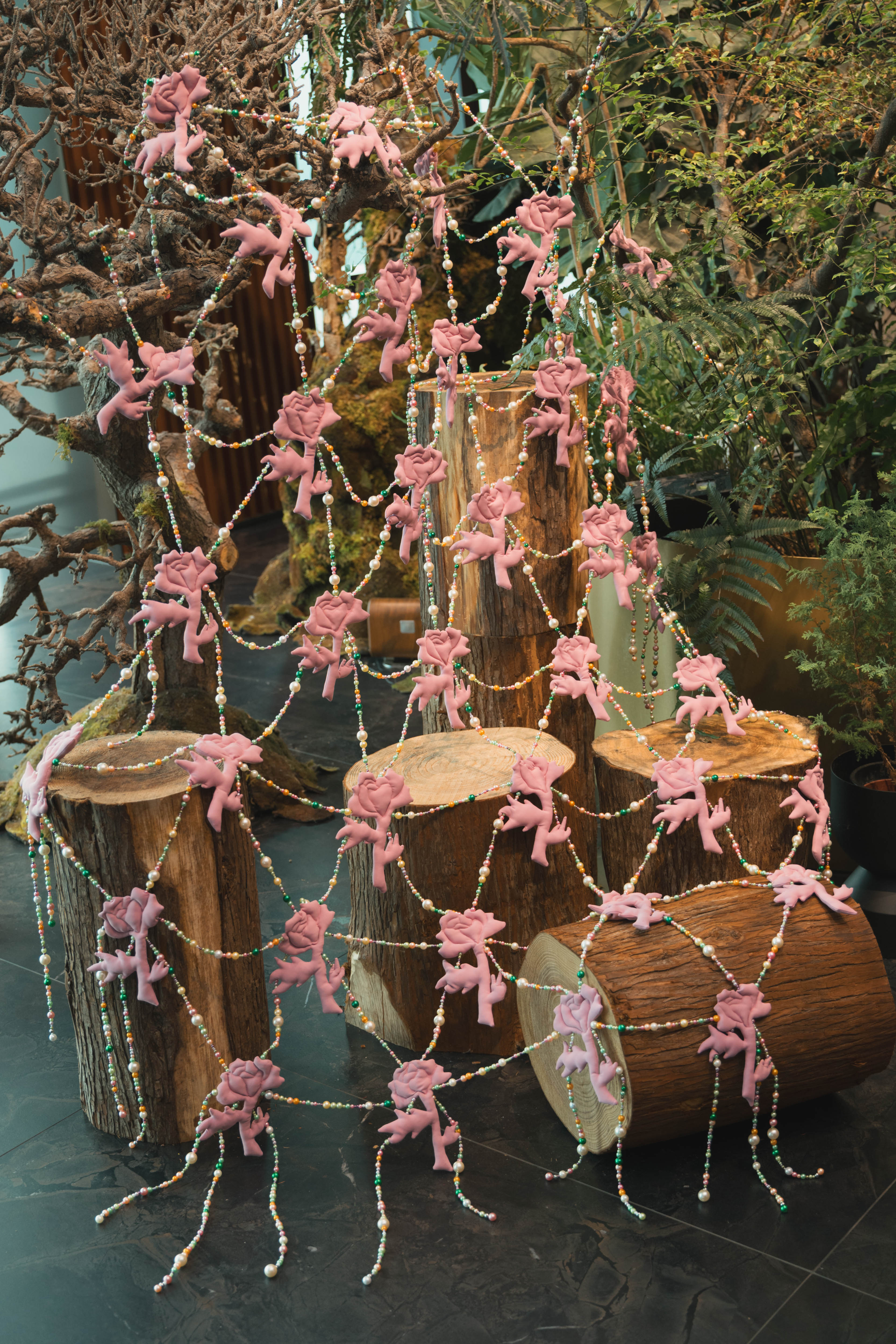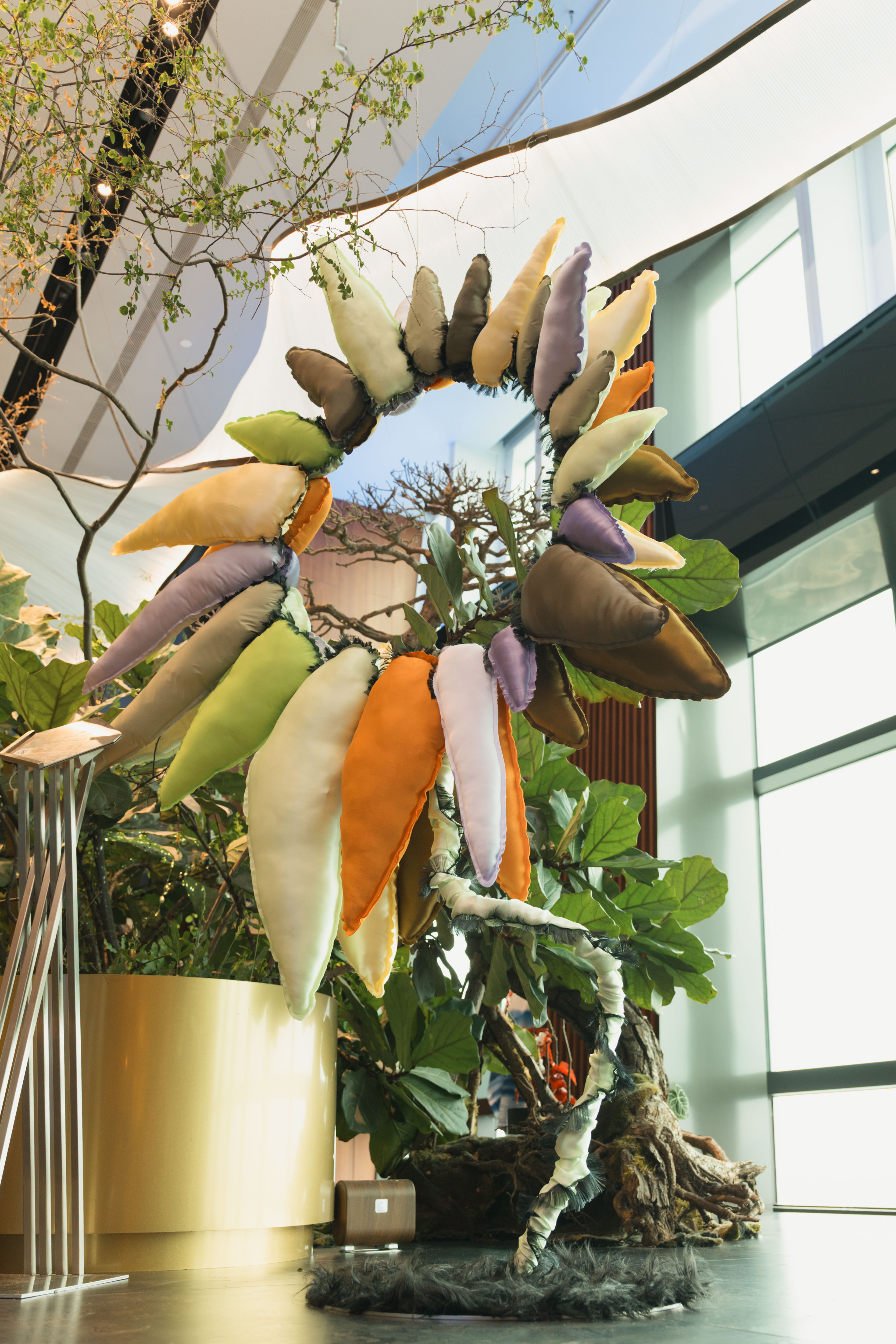 牡丹、蘭花、向日葵與梅花等花卉意象在作品中以放大比例呈現,搭配亮麗色彩與超現實的造型,讓人們一進入饗 A Joy 的大廳,就很像走進一座介於現實與幻想之間的花園。這些花卉的靈感,也來自台灣 1970–80 年代盛行的紅白塑膠袋,上面繪製著象徵祝福與富足的花圖騰。陳聖文將這個文化符碼重新轉化,讓作品不僅談材料、談永續,也延伸至集體記憶。