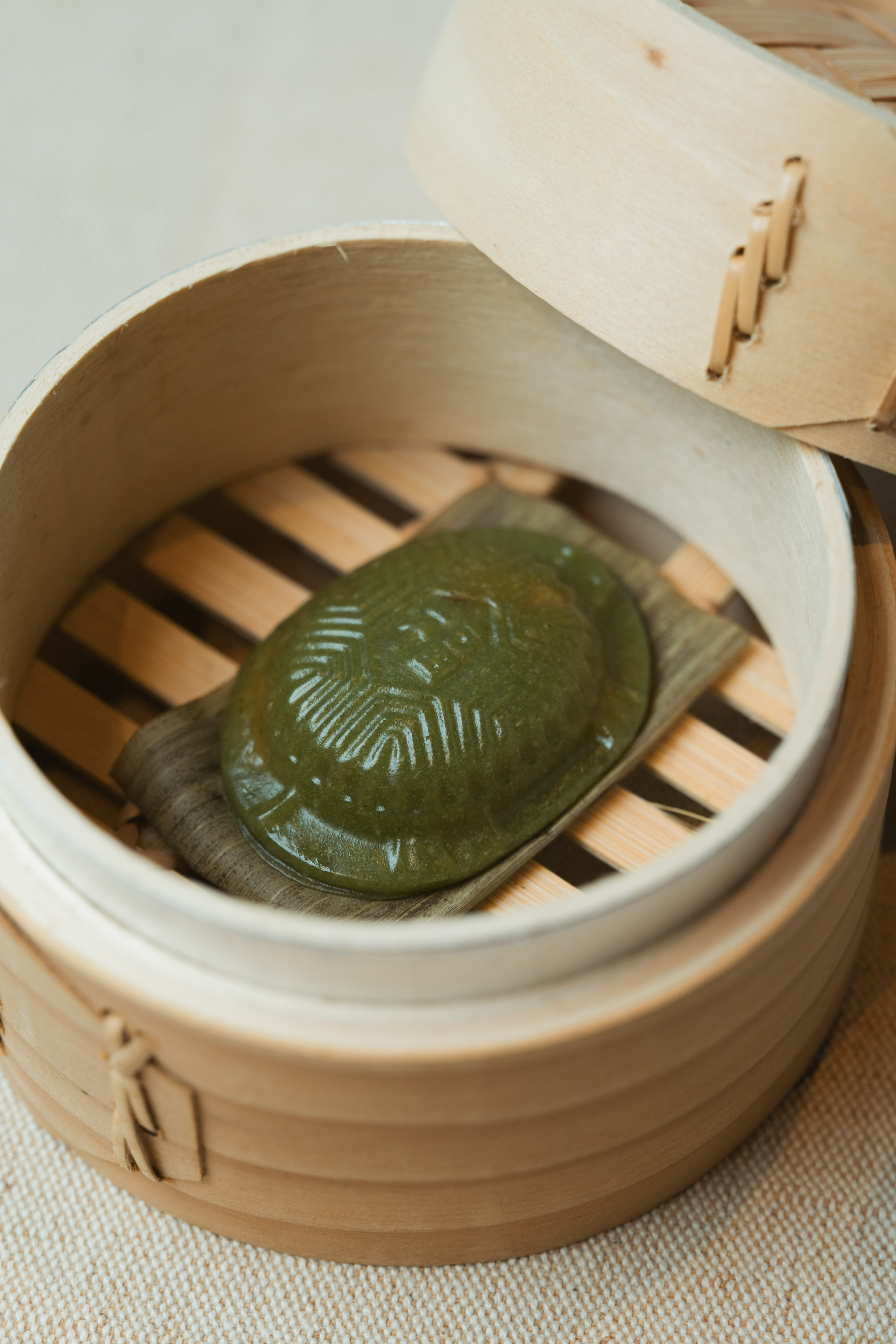 這段記憶分享讓饗 A Joy 主廚有了靈感,主廚以此發想設計出「炙烤肋眼牛排佐煙燻紫薯」與甜點「地瓜草仔粿」。肋眼牛排搭配煙燻香氣的紫薯泥與柑橘酸奶,讓視覺與口感都層次豐富;地瓜草仔粿則使用地瓜葉汁與油蔥酥揉製外皮,包入台農 57 號黃地瓜的內餡,將台灣人都熟悉的點心轉化為更精緻的味覺記憶。