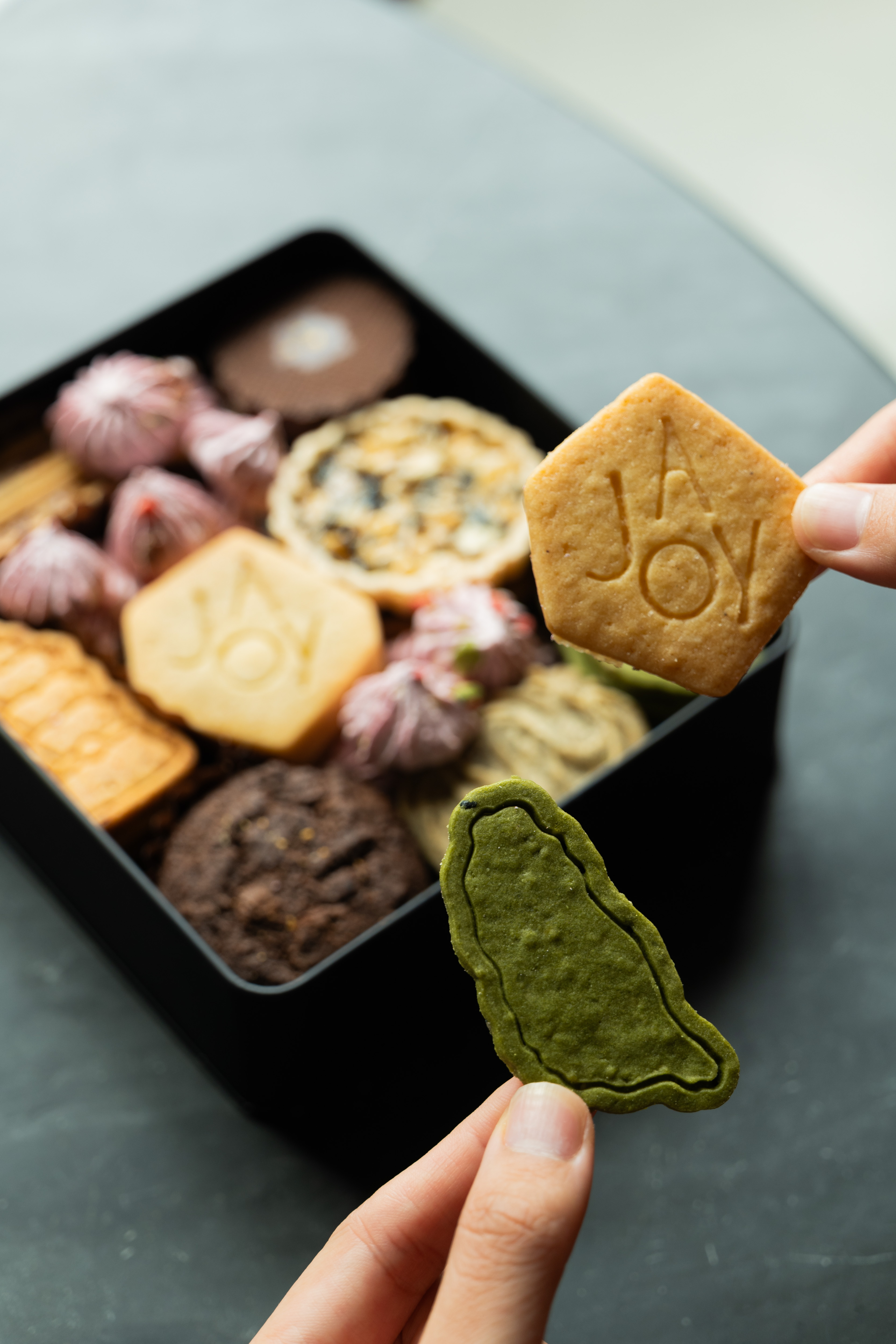 今年的饗 A JOY 節慶禮盒也以《採花》為靈感發想,從作品中的「祝福」與「贈予」出發,將花卉、台灣地景與節慶元素融入餅乾造型與風味設計。禮盒中最具代表性的三款:小綠葉芝麻曲奇以台灣島形狀與芝麻、抹茶呈現土地的色澤;TAIPEI 101 辣起司曲奇則以城市意象轉化為味覺;以及呼應花瓣層層堆疊的覆盆子草莓馬林糖。