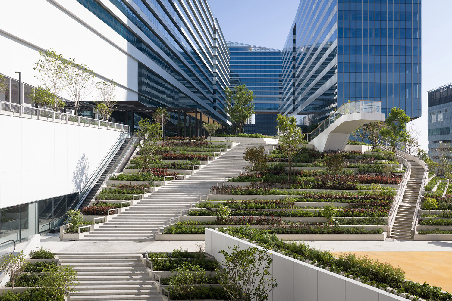 空中花園的尺度足以容納各種活動,從大型演出、市集到日常散步與野餐,都能自在展開。因為量體之間的開口,自然風得以流動其間,打造舒適的微氣候;同時結合遮蔭步道、透水鋪面、雨水花園與低碳環保的戶外家具,使空中花園轉化為連結城市、支持生物多樣性的綠色廊道。