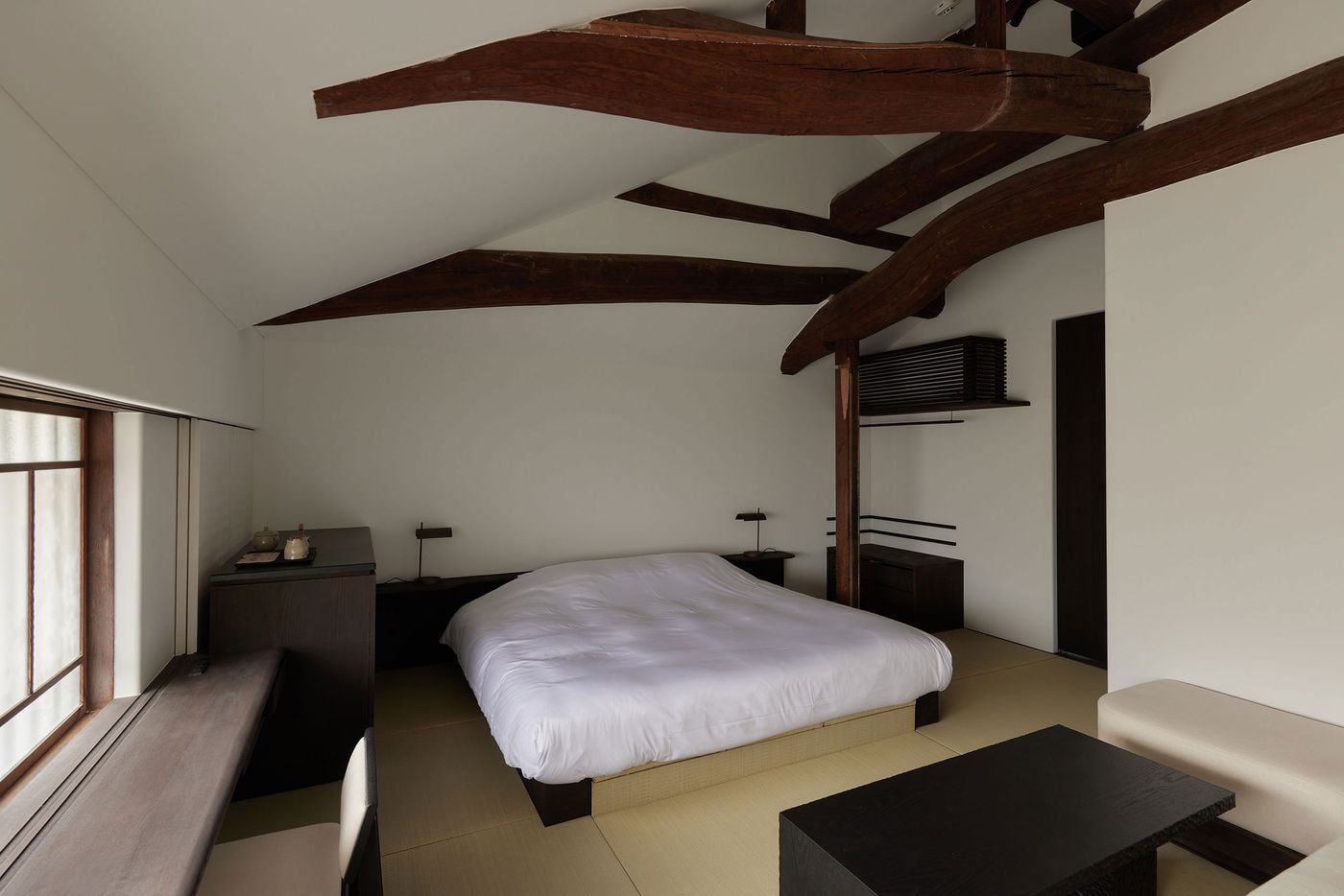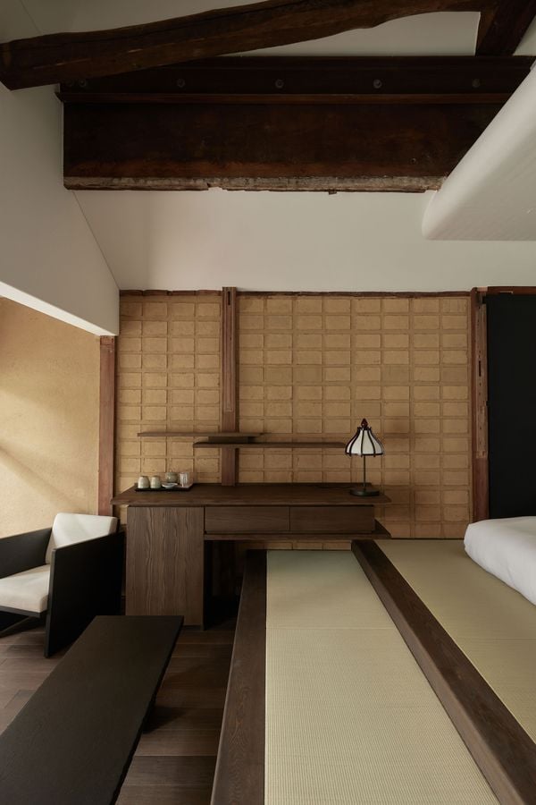 (Photography:Shinsui Ohara)飯店僅有 13 間客房,尺度不大,卻恰到好處。從精巧的單間到複層式空間,部分房型還擁有私人庭院。外露樑柱、榻榻米與和紙拉門,勾勒出老倉敷的質地;而以檜木與杉木打造的當代家具,則讓空間不至於落入懷舊。整體色調收斂於大地色系,搭配手工織品與藝術物件,營造出一種低調的靜謐感。