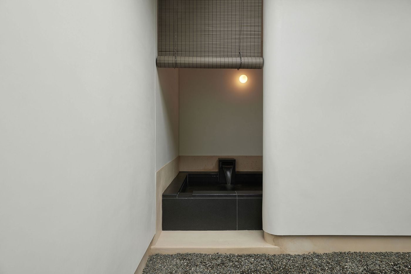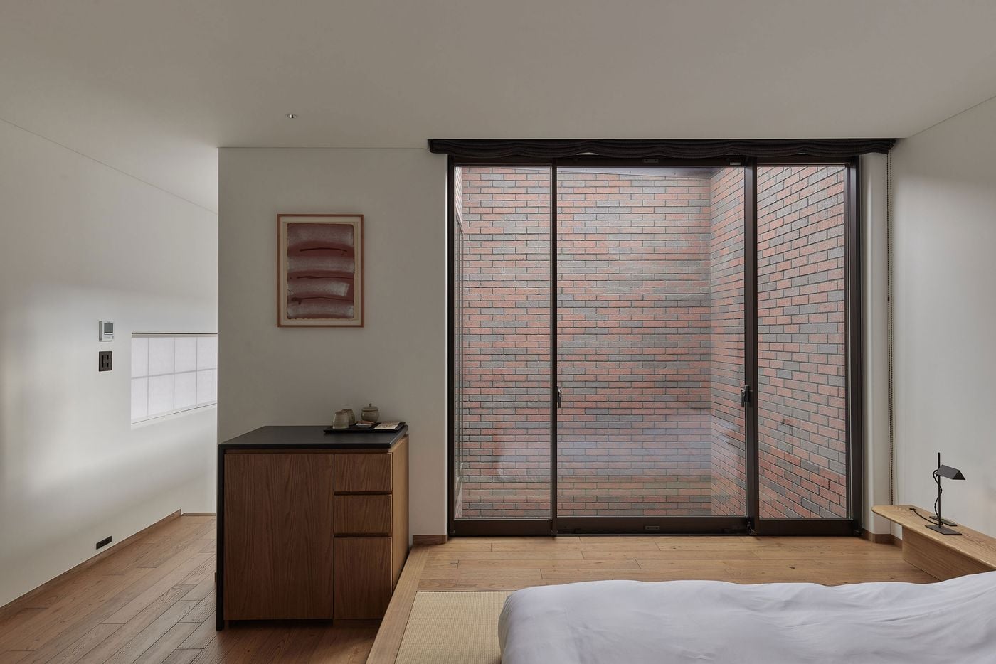 (Photography:Shinsui Ohara)空間配置延續了傳統商人宅邸的邏輯。在靠近街道一側設有對外開放的葡萄酒吧,讓旅人與在地居民共享日常;客房則安置在後方,保留私密與安靜。兩者之間,以一條狹長的「冷巷(hiyasai)」串聯,透過白色灰泥牆與紅磚鋪陳其中,成為公共與私領域之間的緩衝地帶。建築中央的庭院,則像是一個刻意留下的空白,人們可以在此停下腳步。