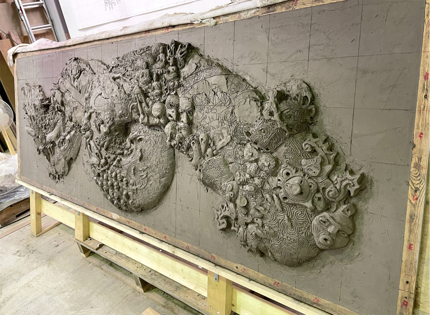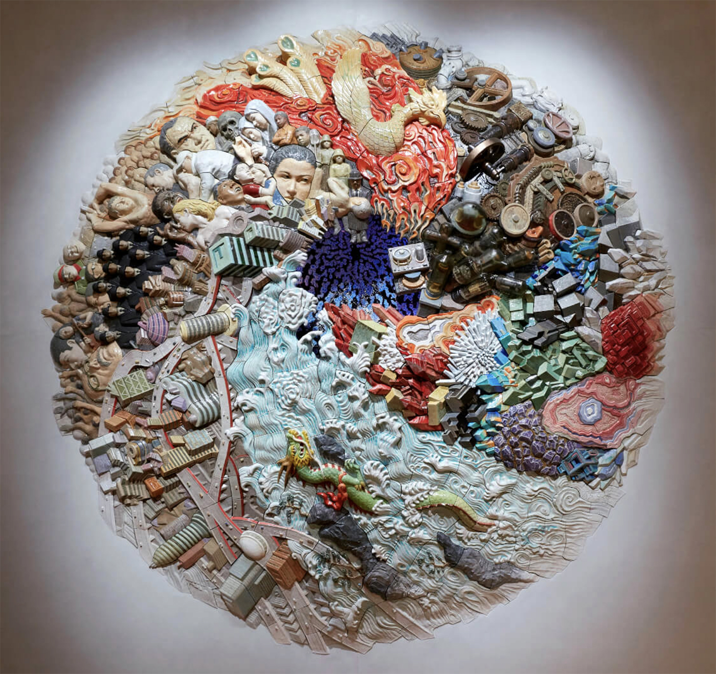 整件作品高約 2.4 公尺、寬 7 公尺,由 164 塊陶板與 4 件青銅構件組成,總計 168 件拼接而成。其視覺重量不僅來自尺度,更來自立體陶板浮雕特有的量感與層次。為了呈現跨越時代的質地差異,製作團隊運用了多達 290 種釉藥反覆搭配、燒製,藉由施釉與燒成條件的細微調整,生成難以預測卻充滿深度的色彩變化。