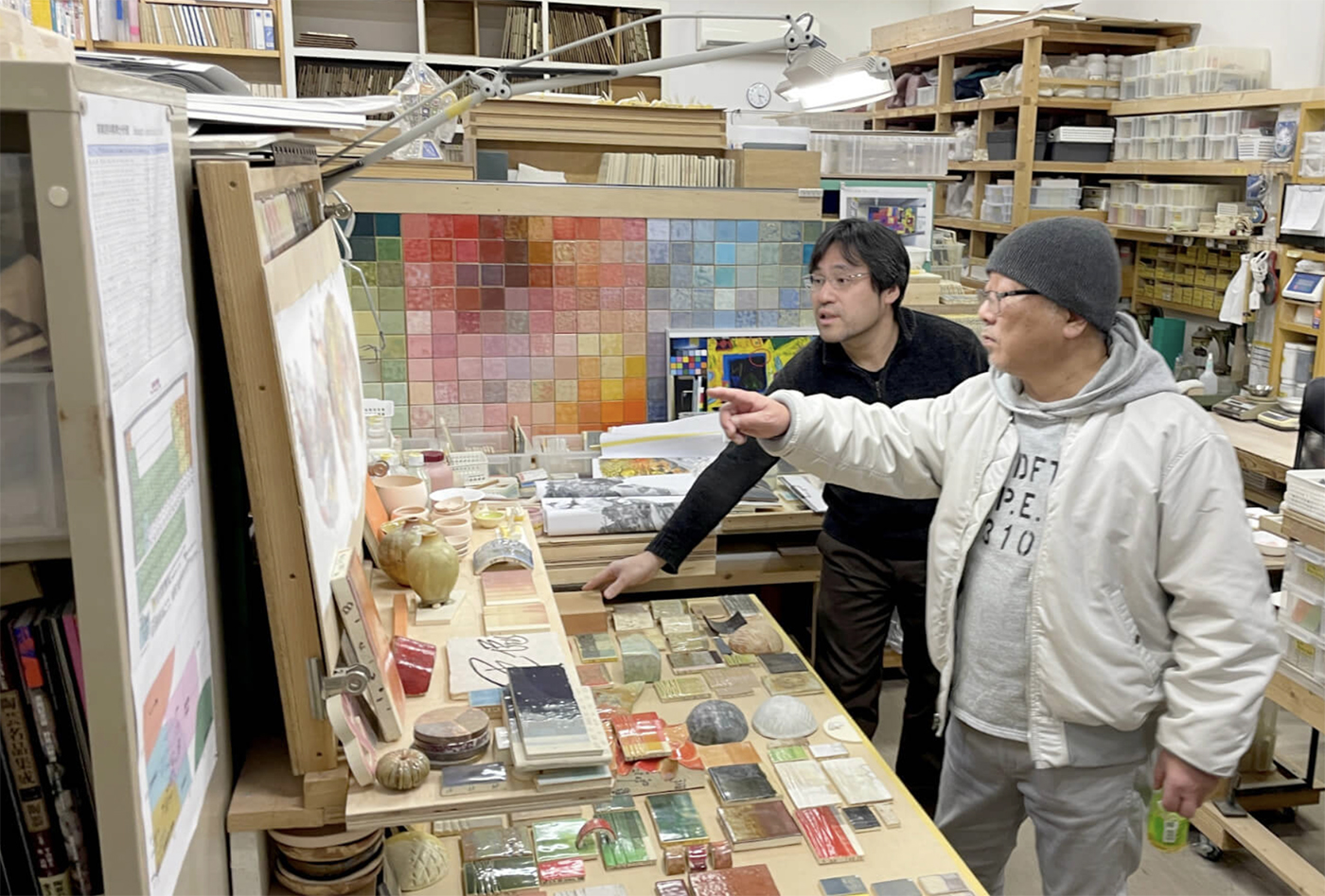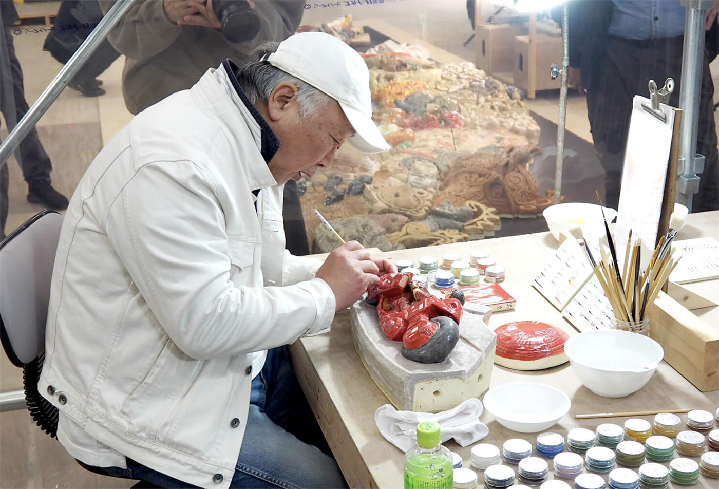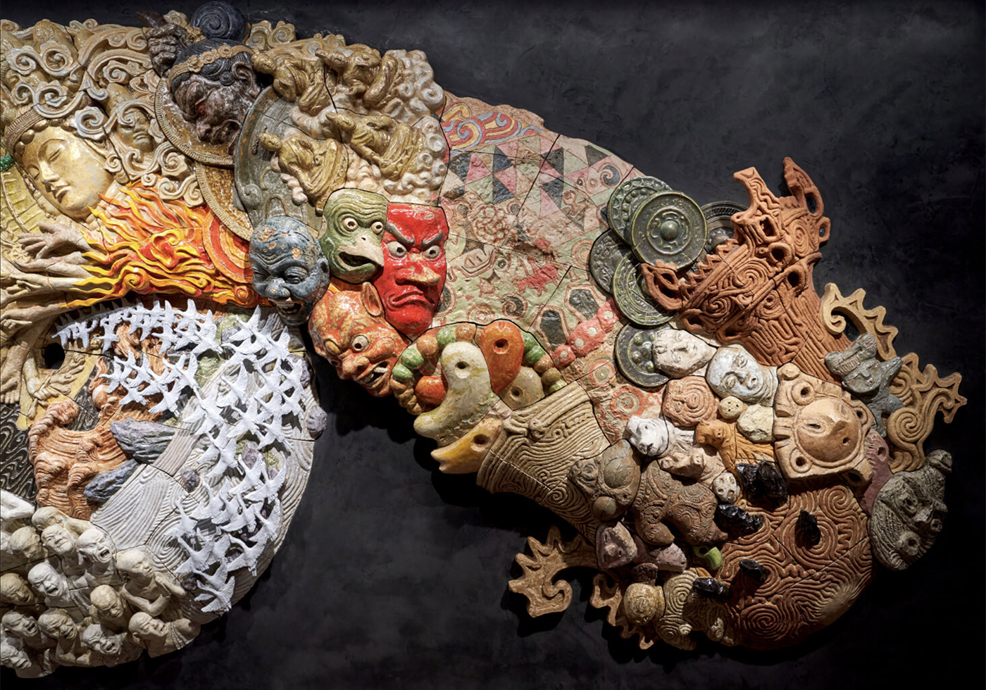 作品右側的繩文土器區段,甚至以稻田土重新調製釉藥,讓器物質感更貼近土地本身;畫面中央的十一面觀音施以金箔,在低調光線中隱約閃現宗教造形的精神性;而朝向左側、指向未來的區域,則透過低溫釉藥的層層疊加,營造出近似金屬的冷冽質感。值得一提的是,左下角那輛經典的《AKIRA》紅色摩托車,其色彩由大友克洋本人親自上色,成為整件作品中最貼近他個人創作記憶的細節。