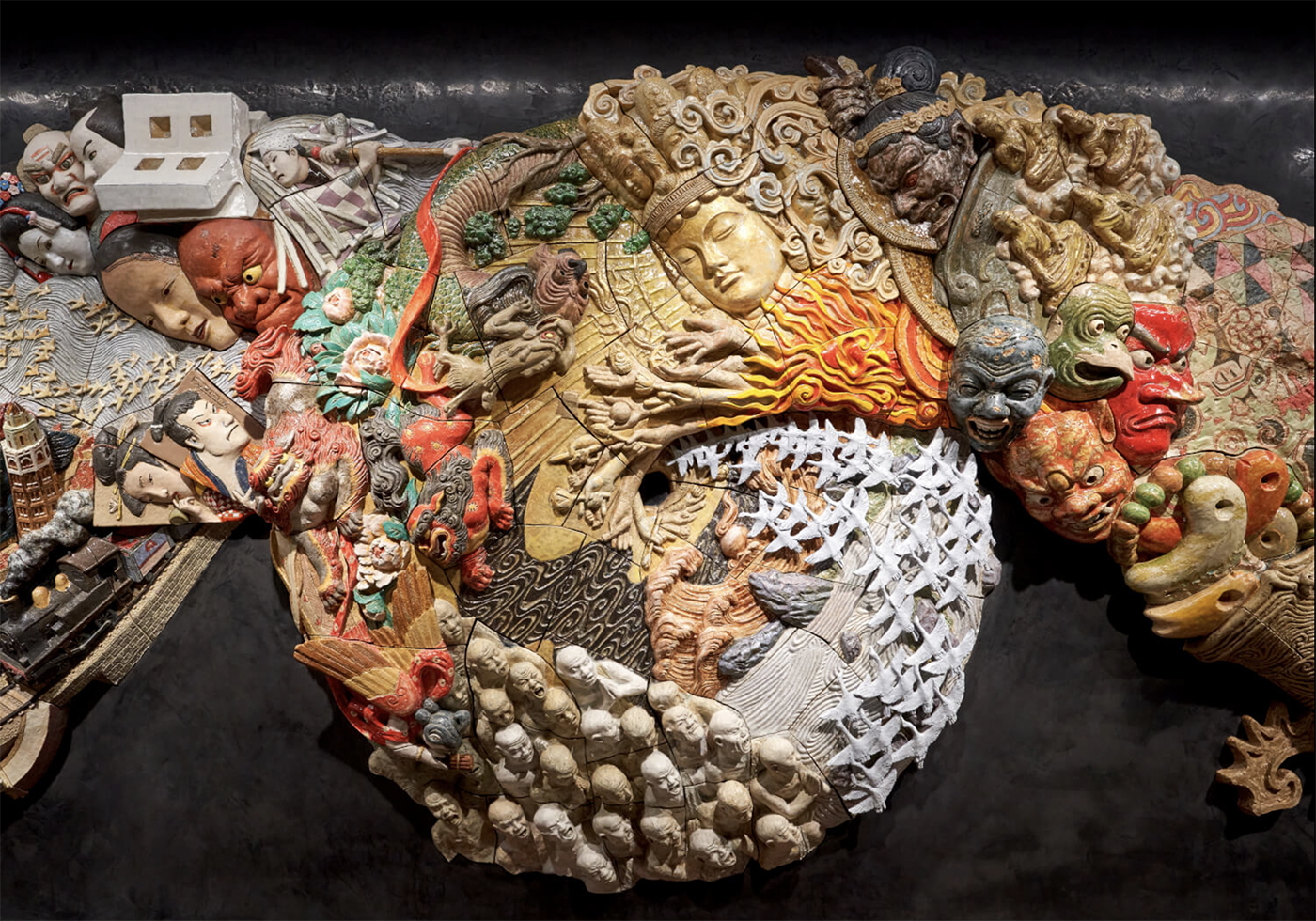 作為此一計畫中的第 563 件公共藝術作品,《Procession Spin》並未試圖以編年史方式重述歷史,而是從「時間如何流動」這個更為根本的提問出發。作品名稱可直譯為「旋回的行列」,象徵歷史並非線性推進,而是不斷回旋、蛇行、層層堆疊的過程。大友克洋將自繩文時代以來,人類所創造的美術、工藝、宗教造形、設計與工業意象,密集地編織進一股翻湧的視覺渦流之中,讓不同時代的想像在同一平面與立體深度中相互碰撞。