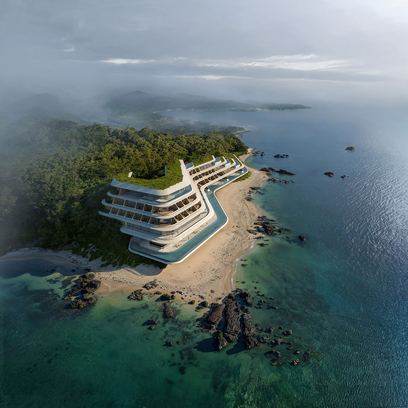 ZHA 的專案總監 Ludovico Lombardi 表示,設計延續了團隊長期對自然地形生成的研究脈絡,他們從當地的白砂海岸、森林地貌與起伏地勢汲取靈感,透過層層退縮的遮棚式屋簷與段狀露台,讓建築輪廓柔和地銜接海岸線與熱帶植被,在不遮擋海景的前提下,同時保有開放感與高度私密性。而飯店中標誌性的巨大屋簷結構,也可視為對沖繩傳統建築深遠屋簷意象的當代轉譯。
