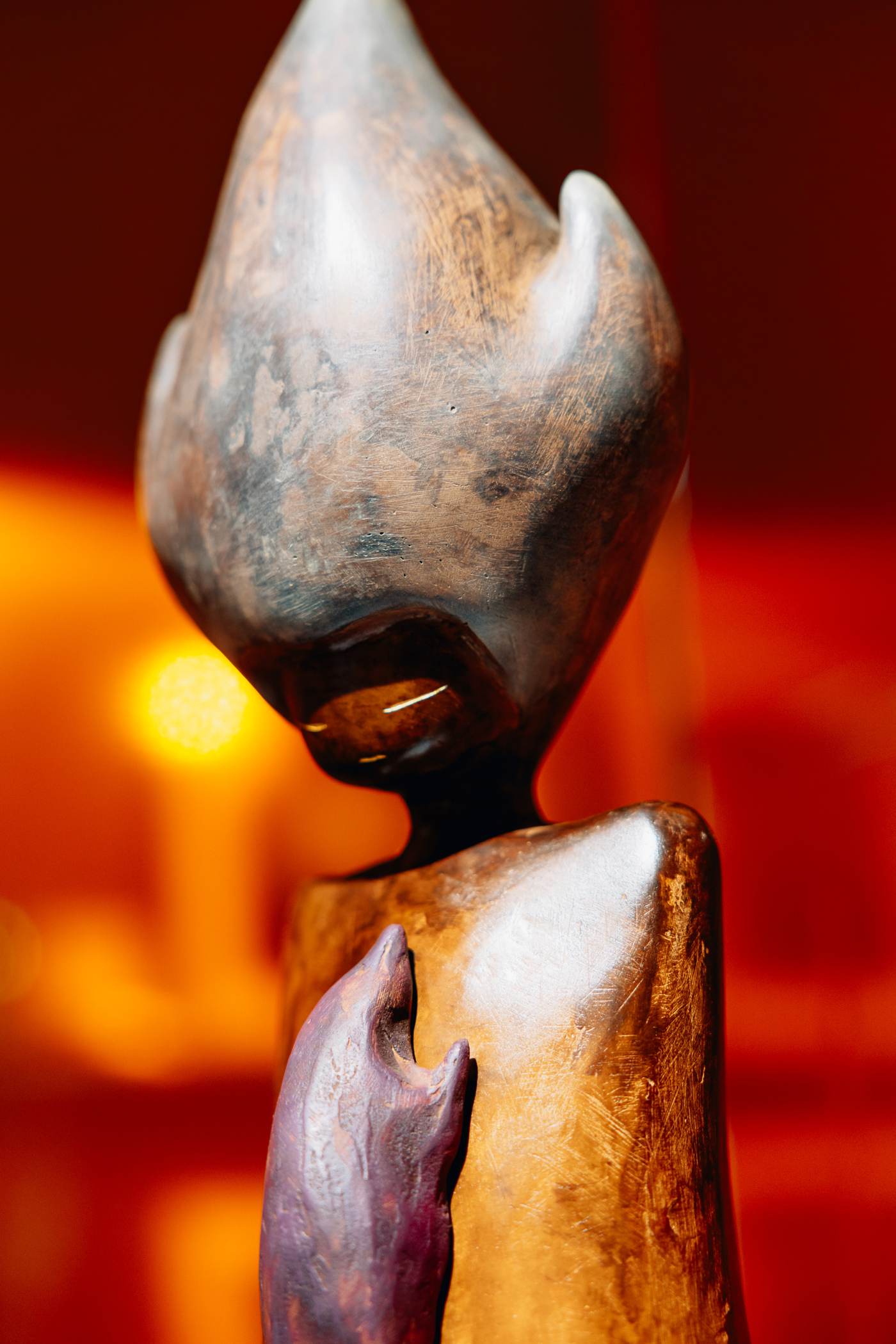 在當代追求速度的快步調中,藝術家夏愛華的創作路走得緩慢而執著。大學主攻木雕藝術的她,研究所時因緣際會認識了過去用於神像雕塑的「活脫乾漆」技法,並以此塑造出看不見的潛意識。由於此項技藝需反覆塗抹漆樹汁液、黏貼麻布至一定厚度後再抽離原模,過程中不只需要透過濕氣讓漆氧化,也需要陽光為漆「發色」,一件作品的誕生往往需耗時半年至數年不等,卻也正是這份彷彿吸收日月精華般的沉穩氣息,讓夏愛華的作品擁有超越時空的寧靜與厚度。