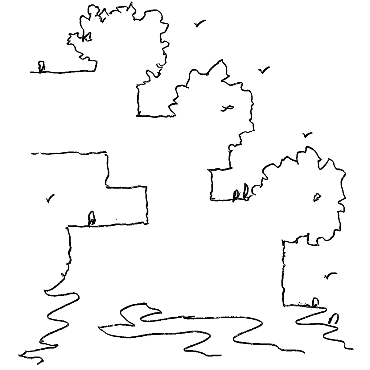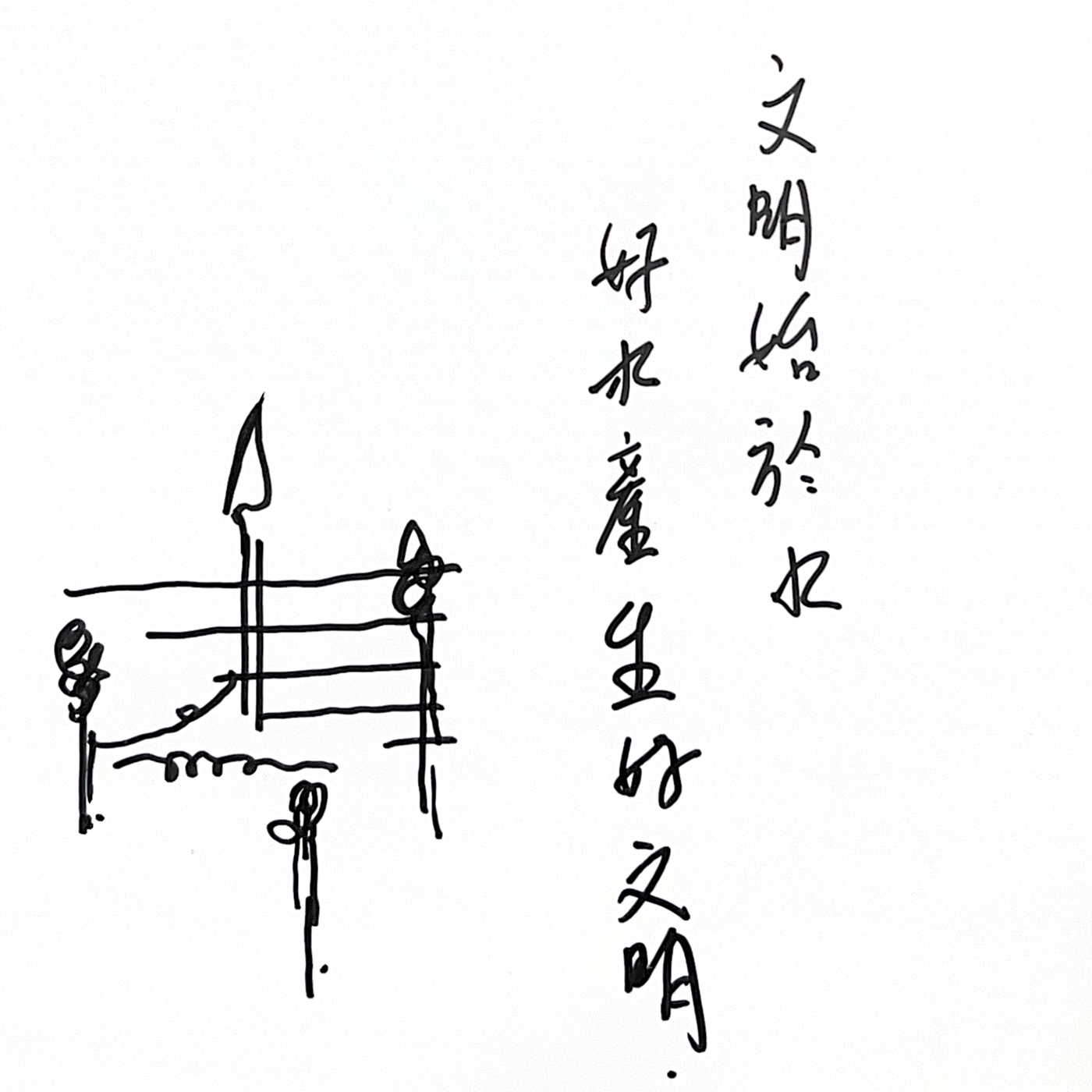 這張草圖展現了平田晃久對於「人、自然與建築共存」的思考。建築線條與樹木和水流相互連接,反映他建築哲思核心中的「纏繞的相容性」之概念。而這樣的共生關係看似穩固,在未來也許一個彈指之間就消散,或許在那曖昧界線之間,建築應該以柔韌的姿態擁抱環境的變遷。