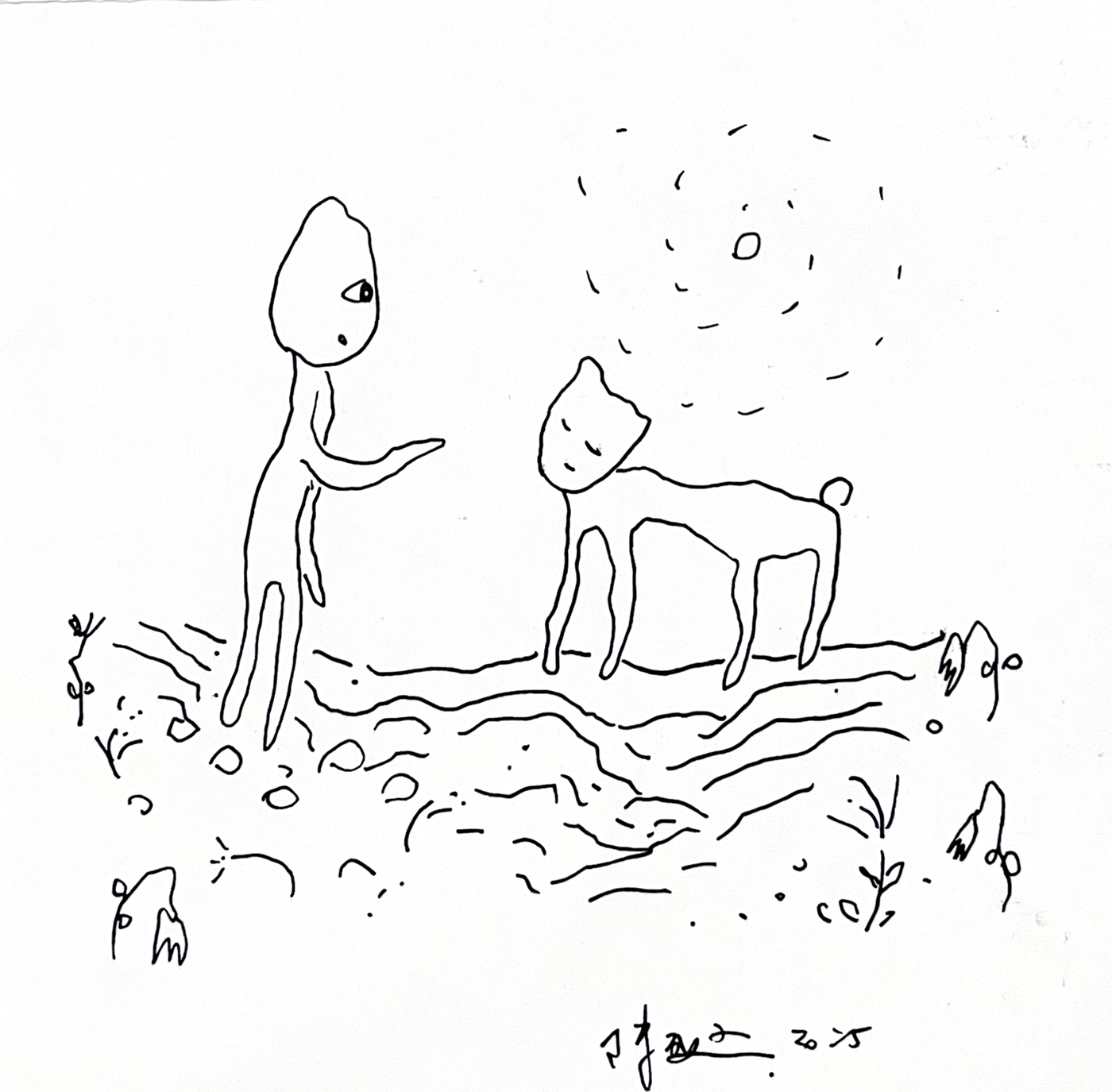 趁著來台舉辦展覽之際,我們邀請平田晃久寫下他對於「明日」的想像,他選擇不以文字回應,而是以一幅插圖,詩意地描繪人、樹木、水流與建築線條彼此連結、交錯共存的場景。畫面中看似穩固而和諧的共生關係,卻隱約透露出隨時可能鬆動、消散的脆弱性,這樣的張力,正呼應他所提出的「纏繞的相容性」概念:不同元素之間並非完美融合,而是在差異與摩擦中維持暫時的平衡。平田晃久的筆下,不僅是他對明日的想像,也是一個關於當代建築該如何面對自然、回應環境,並在不確定性中尋找共存方式的溫柔提問。