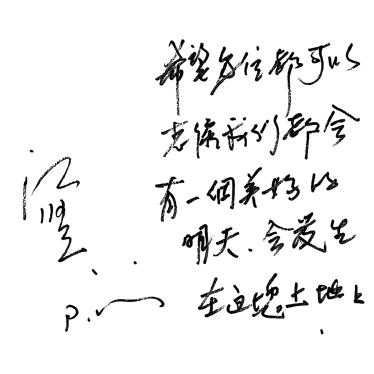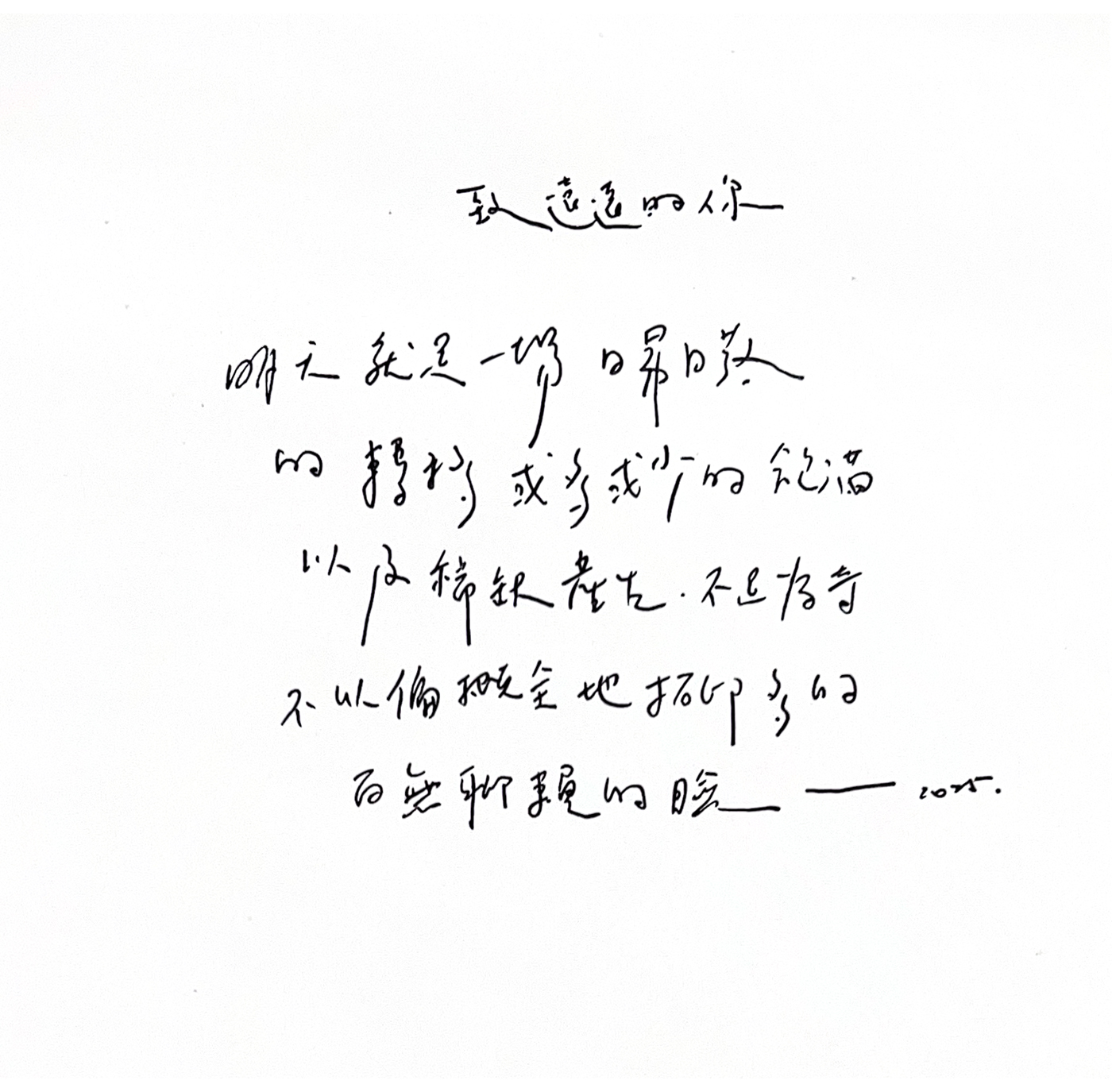 陳威廷不僅在卡片上畫了一幅可愛的插畫,有著其作品中常見的太陽、小花和形象角色,他也寫下了一段短詩,文字之中,日昇日落、飽滿與稀缺、轉移與生成交錯出現,彷彿在描繪時間自身的流動方式。明日對陳威廷來說,似乎不是一個線性前進的終點,而是一場不斷位移的過程;或許最好的明天,就是擁抱生命中的不確定性,在平凡中尋找屬於自己的意義。