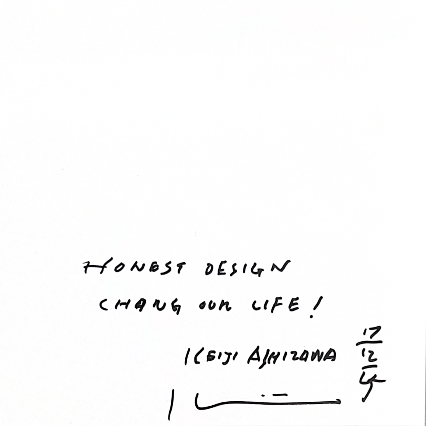 芦沢啓治以大寫英文在明日小卡上寫下:「HONEST DESIGN CHANGE OUR LIFE!」直接又毫不修飾地展現他一貫的設計態度,「誠實」不是風格,而是一種對材料、製程與使用方式的尊重。他相信,當設計回歸本質、忠於真實需求,便能在不知不覺中影響人們的生活方式,而這樣緩慢卻深遠的改變,正是通往美好明日的重要力量。