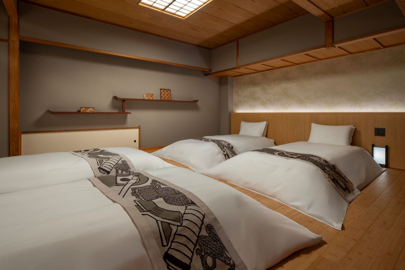 改裝後的客房空間以東海道旅人為主題,牆面藝術取材自過往旅人遮風避雨的三度笠與引廻合羽,床旗上則隱約可見草鞋與燈籠的圖樣。不復刻歷史,而是以當代設計語言,讓旅人意識到自己正站在一條被無數人走過的路上。