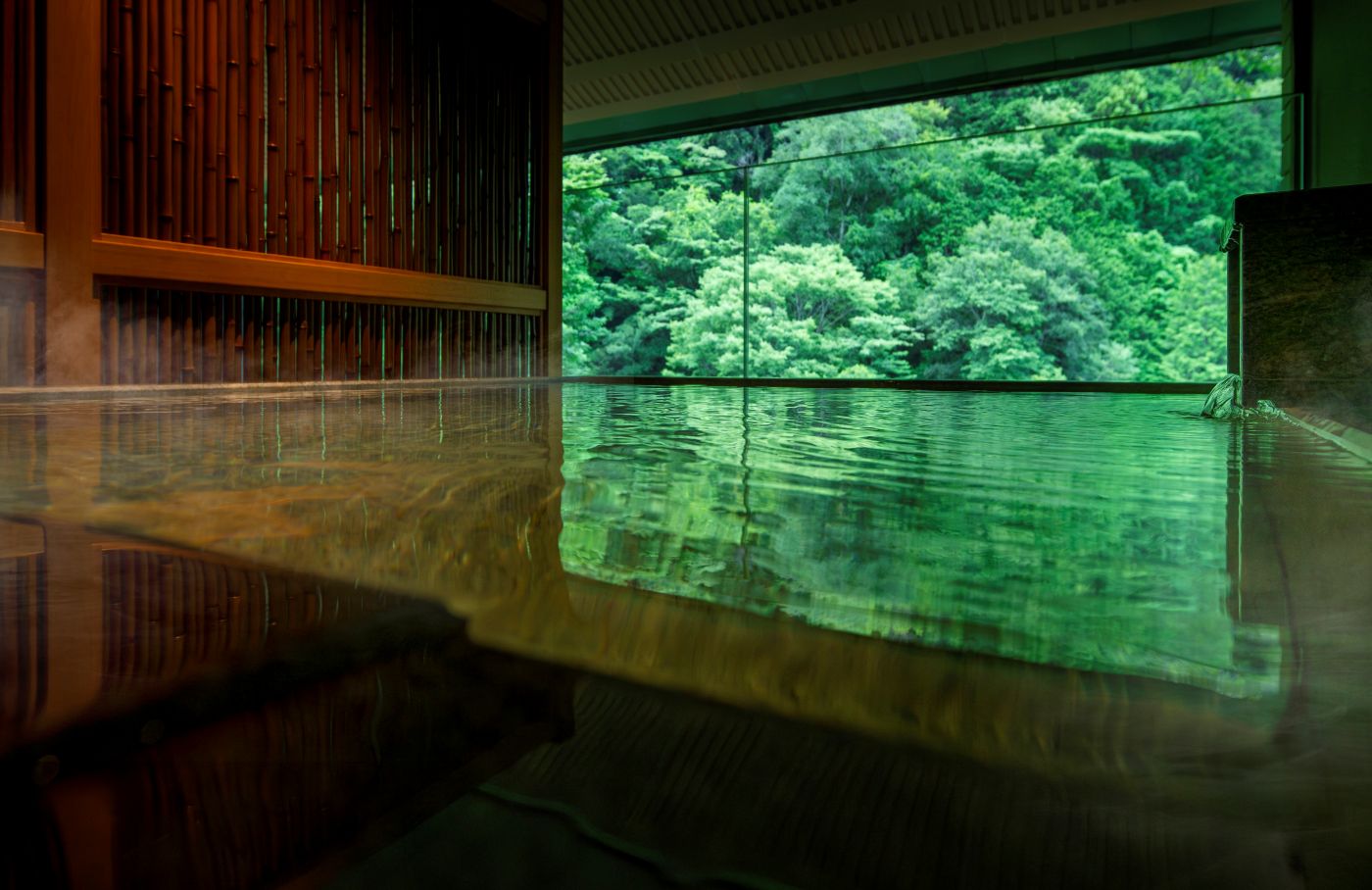 半露天大浴場面向湯坂山,近距離仰望大楓樹的枝葉,四季在水面倒映。箱根湯本溫泉屬鈉氯化物泉,泉水中的鹽分能包覆肌膚,使身體在泡湯後仍長時間保持溫暖。此刻,時間彷彿再次回到東海道旅人一夜湯治的節奏,只剩下呼吸、流水與自然。
