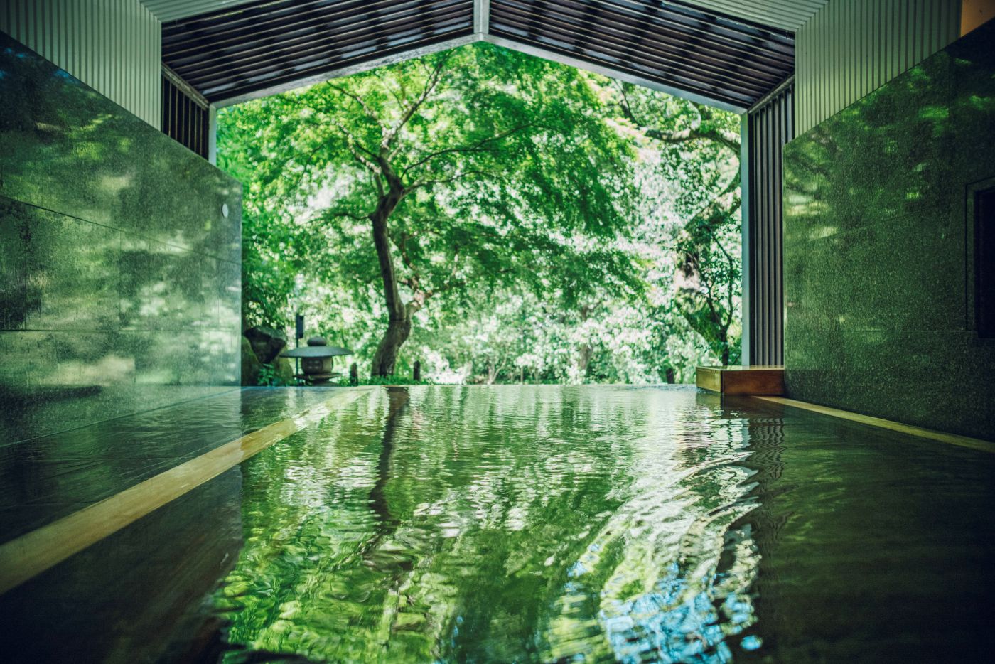 「界 箱根」大浴場_新綠。在開放感十足的半露天大浴場中,旅客可以仰望近在咫尺的大楓樹,享受泡湯樂趣。(photo credit:星野集團 界 箱根)